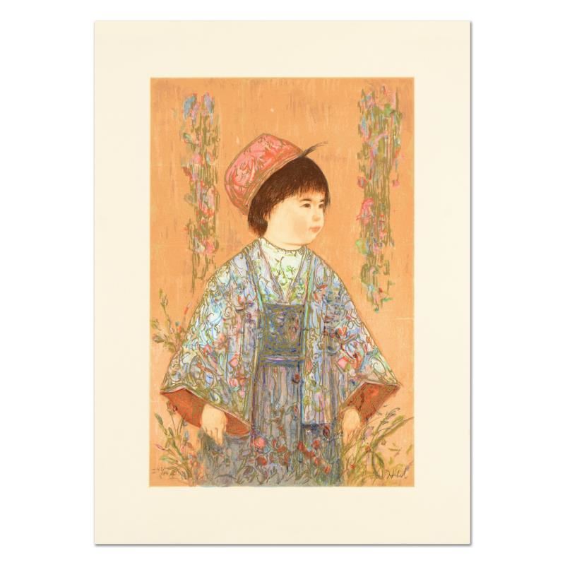 "Festival Day" is a limited edition lithograph on paper by Edna Hibel (1917-2014), numbered and hand signed by the artist. Includes Certificate of Authenticity. Measures approx. 14.5" x 20" (border), 10" x 15.5" (image).