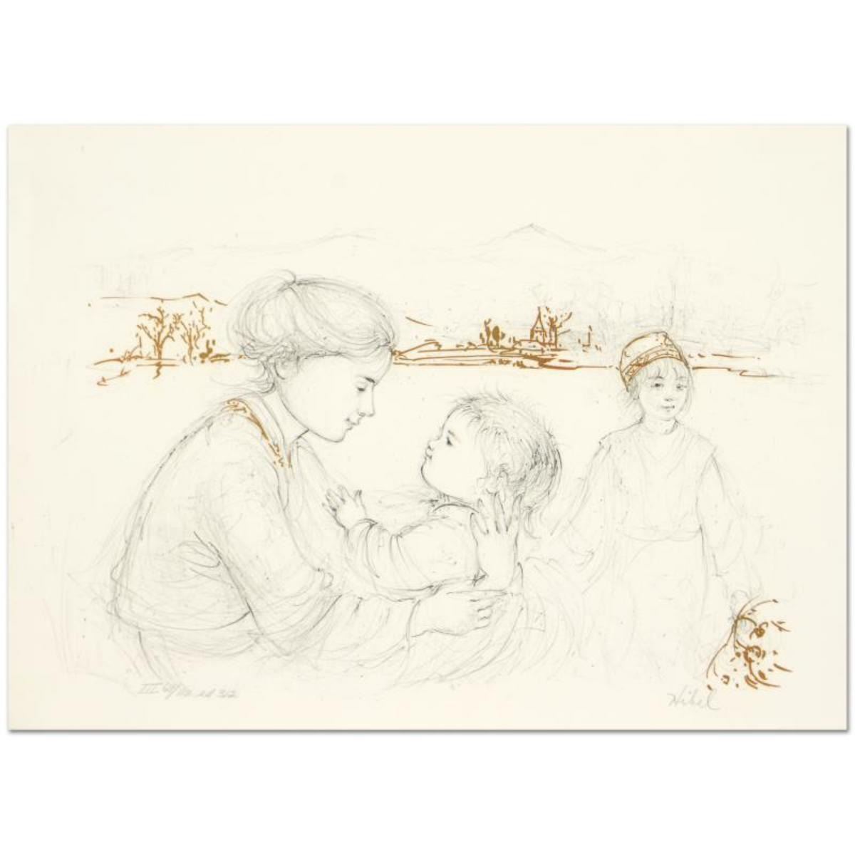 "Playful Mother and Baby" is a limited edition lithograph on paper with remarque by Edna Hibel (1917-2014), numbered and hand signed by the artist. Includes Certificate of Authenticity. Measures approx. 16" x 11.5" (image). Reference #: 228366.