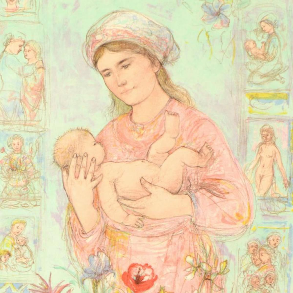 "Raquela" is a limited edition lithograph on rice paper by Edna Hibel (1917-2014), numbered and hand signed by the artist. Includes Certificate of Authenticity. Measures approx. 26.5" x 37.5" (border), 23" x 33" (image). Reference #: 228242.