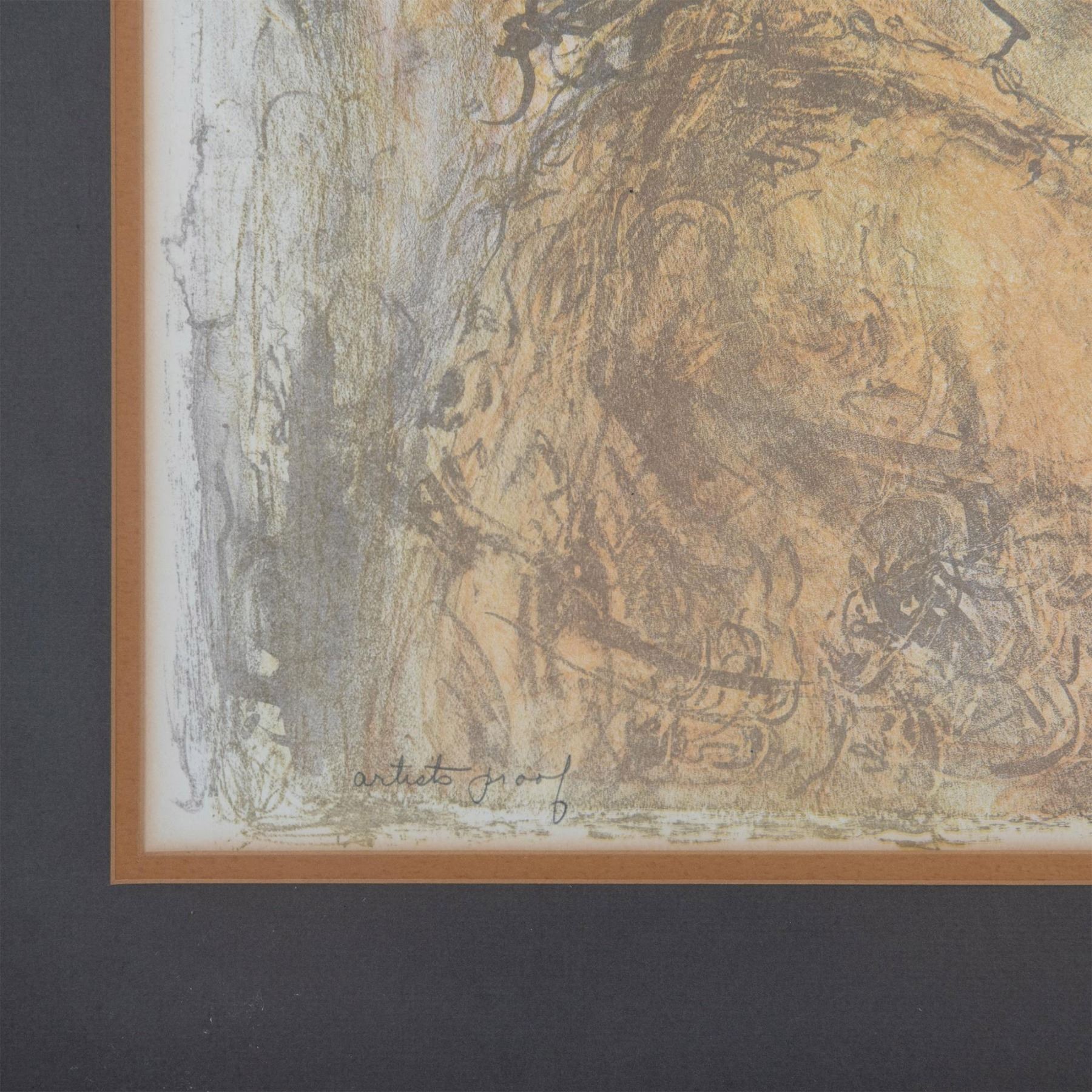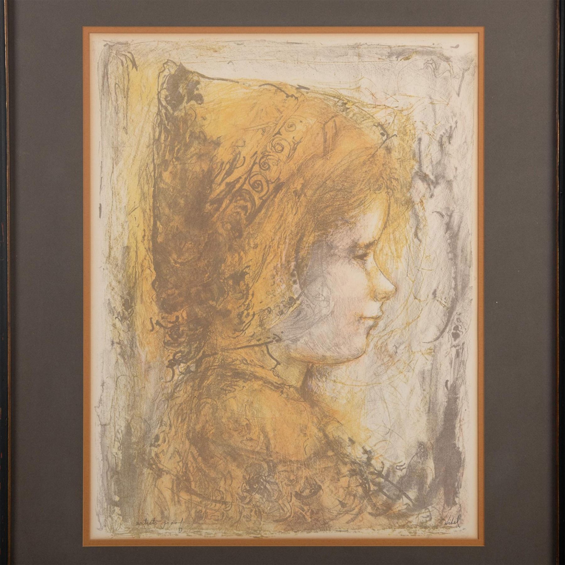 Dutch Girl is an original color lithograph on paper featuring the profile of a young child wearing a small bonnet by American artist Edna Hibel who used a palette of light browns and soft yellows. Signature in graphite on lower right: Hibel. Edition number on lower left: Artists Proof. Housed in the original black and gilded wooden frame with a brown mat. Sight size: 14"L x 18"H. Frame dimensions: 22"L x 26"H x 1.50"W. Artwork can be unframed and rolled for shipment.