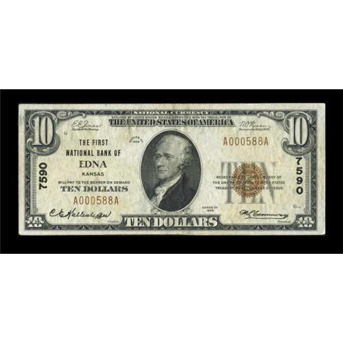 <B>Edna, KS</B></I> - $10 1929 Ty. 1 <B>The First NB</B></I> Ch. # 7590<BR> Bank title and serial number embossing is still evident on this <B>Very Fine+ </B></I>$10. The last time we were able to offer any note on this Labette County bank was back in January 1994.<BR><I>From The J.S. Weber Collection.</B></I><BR><BR><b>Shipping:</b> Coins & Currency (<a target="_blank" href="http://www.heritageauctions.com/common/shipping.php">view shipping information</a>)