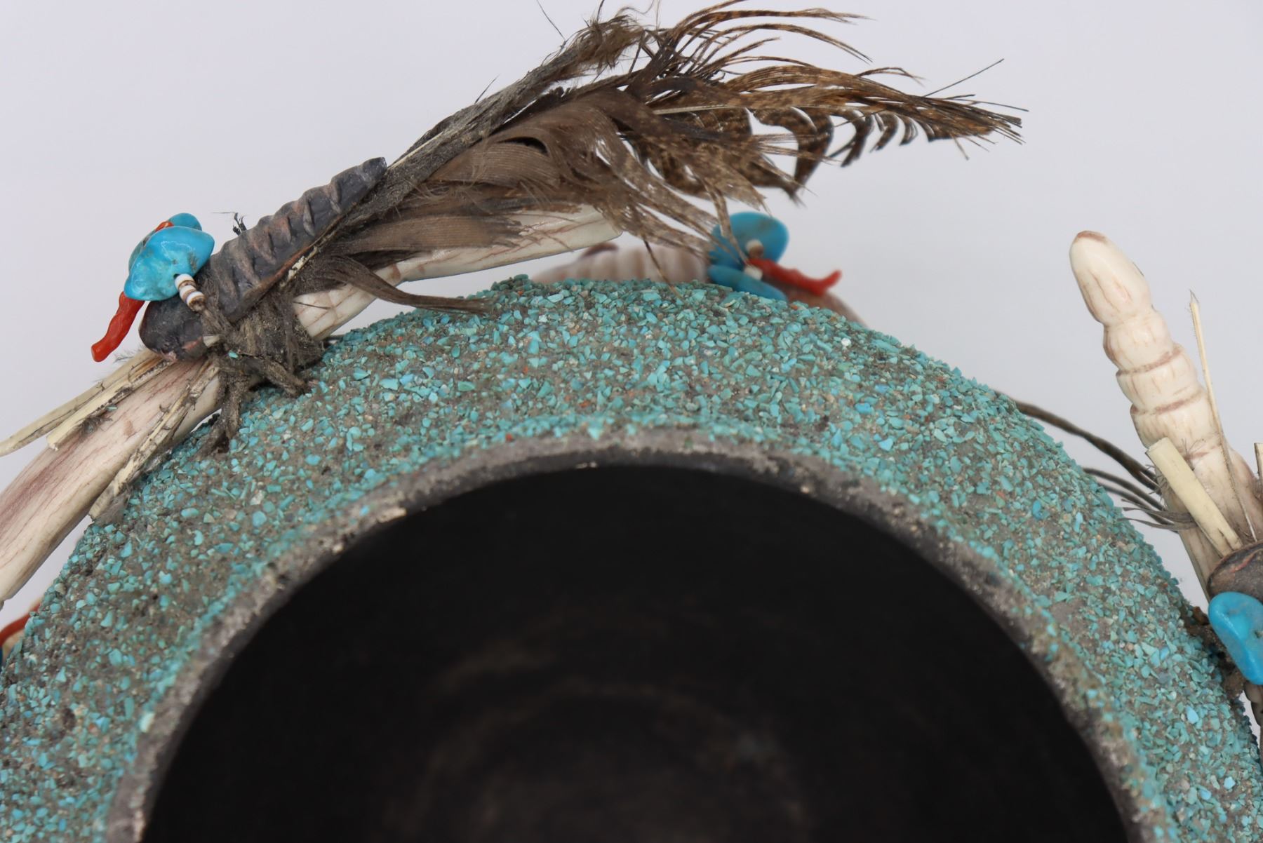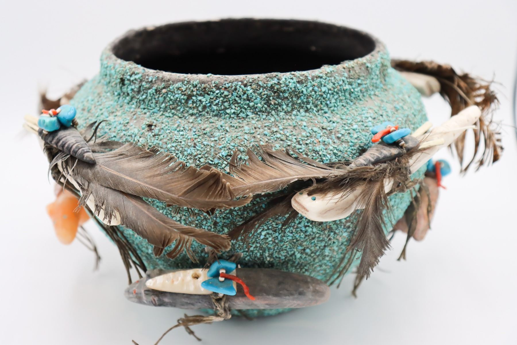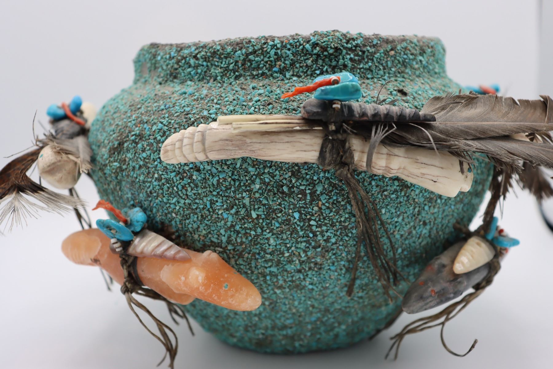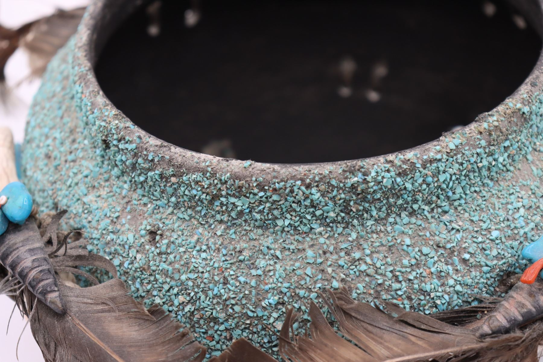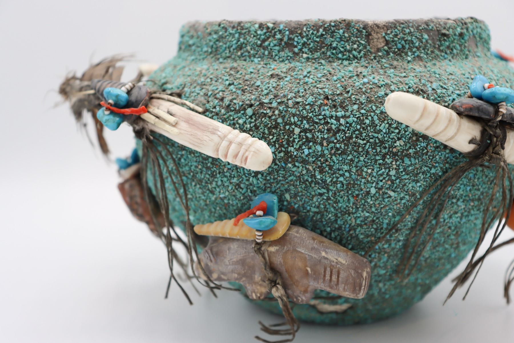 Southwestern American Indian decorated bowl by Edna Leki, adorned with crushed turquoise chips and eight very large Zuni fetish carvings with feathers, each attached to the vessel with sinew.