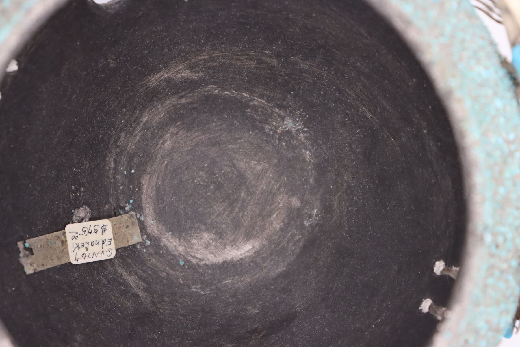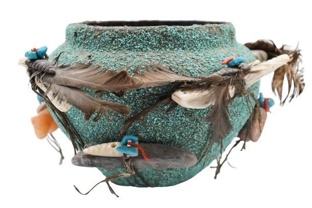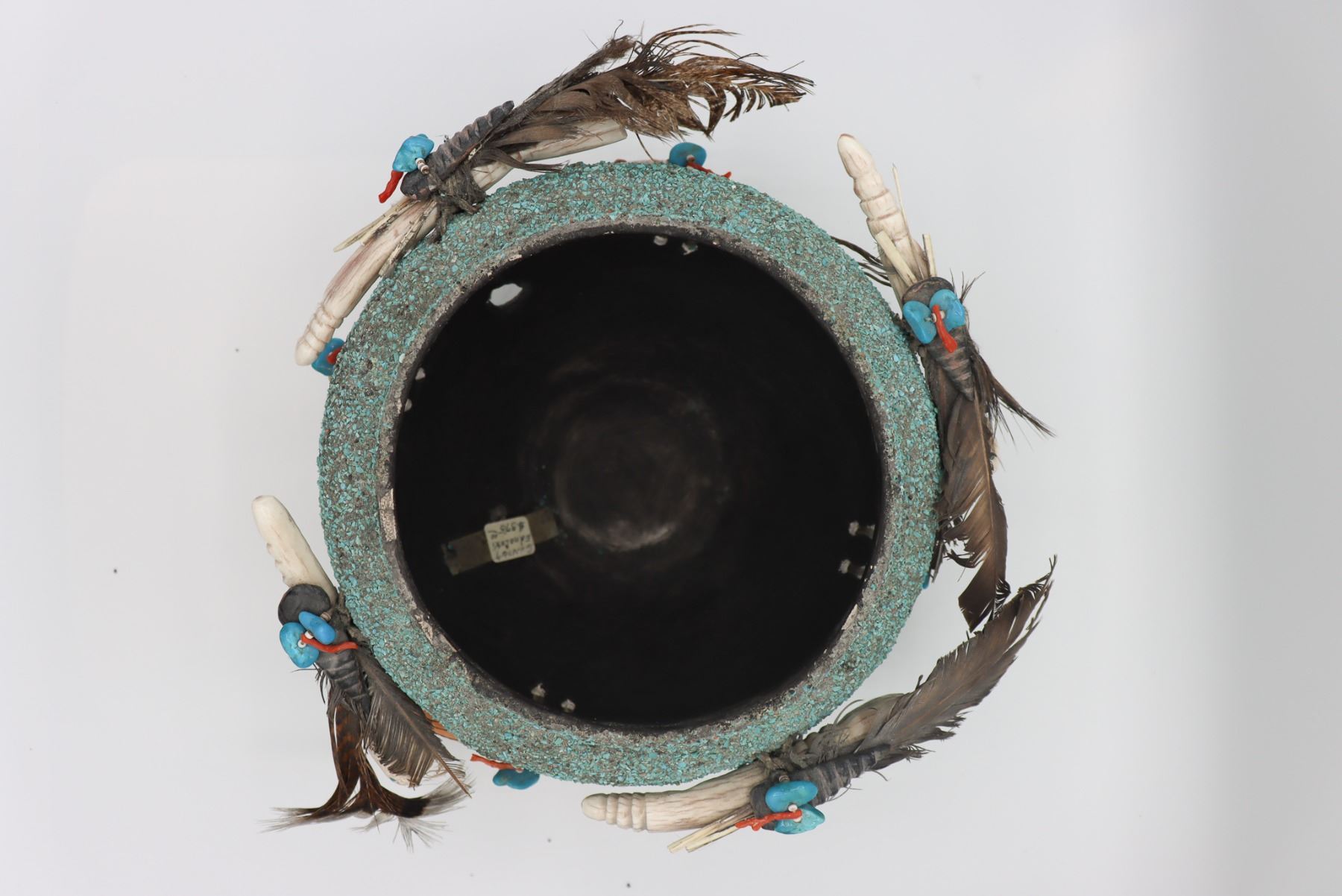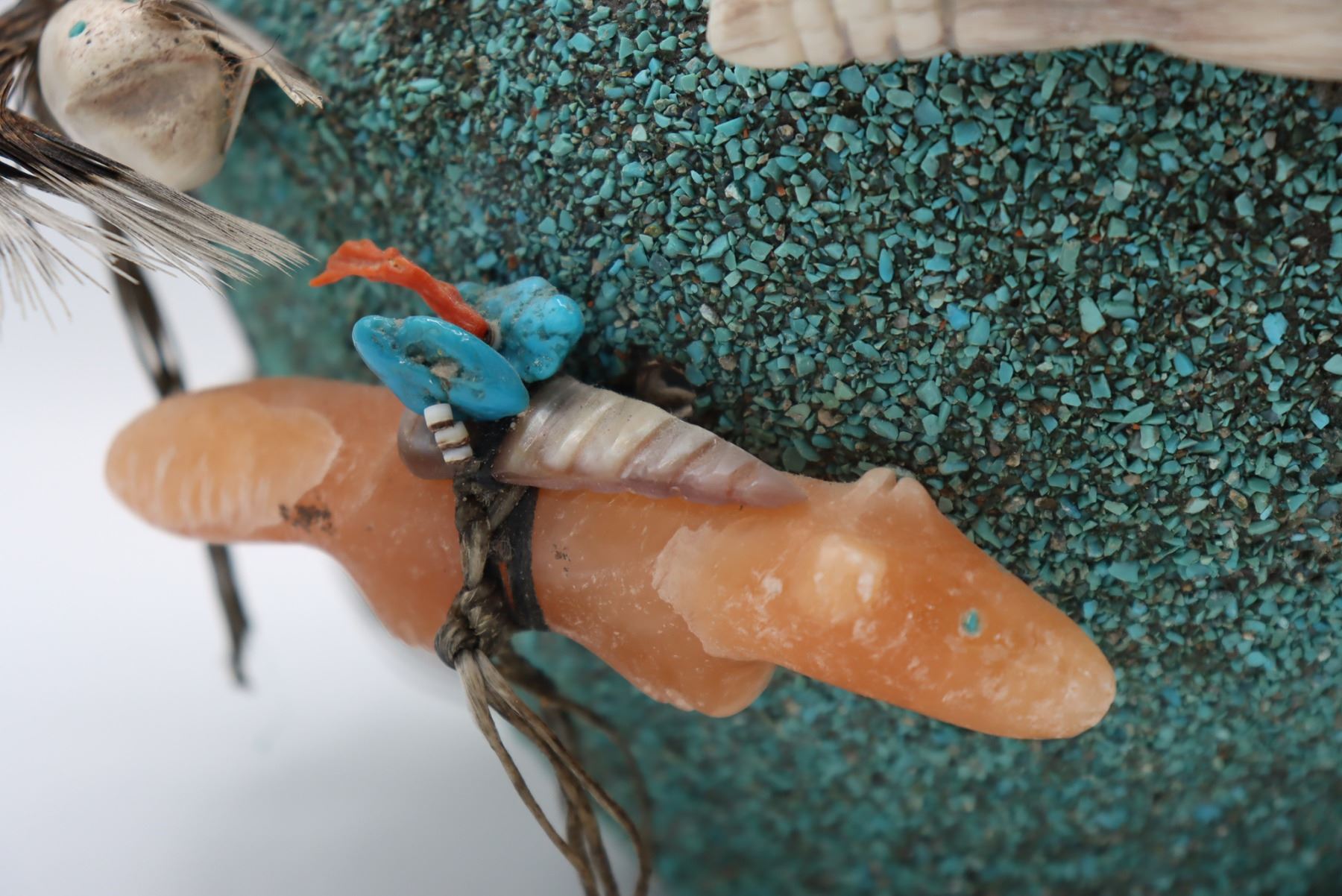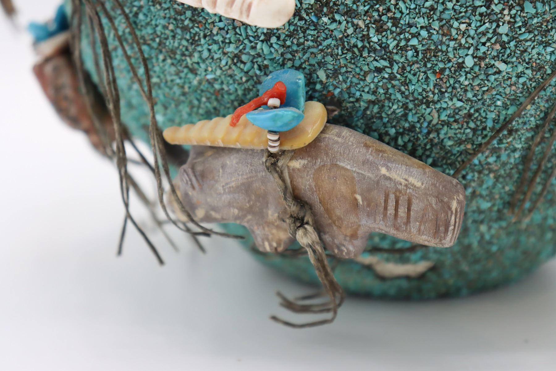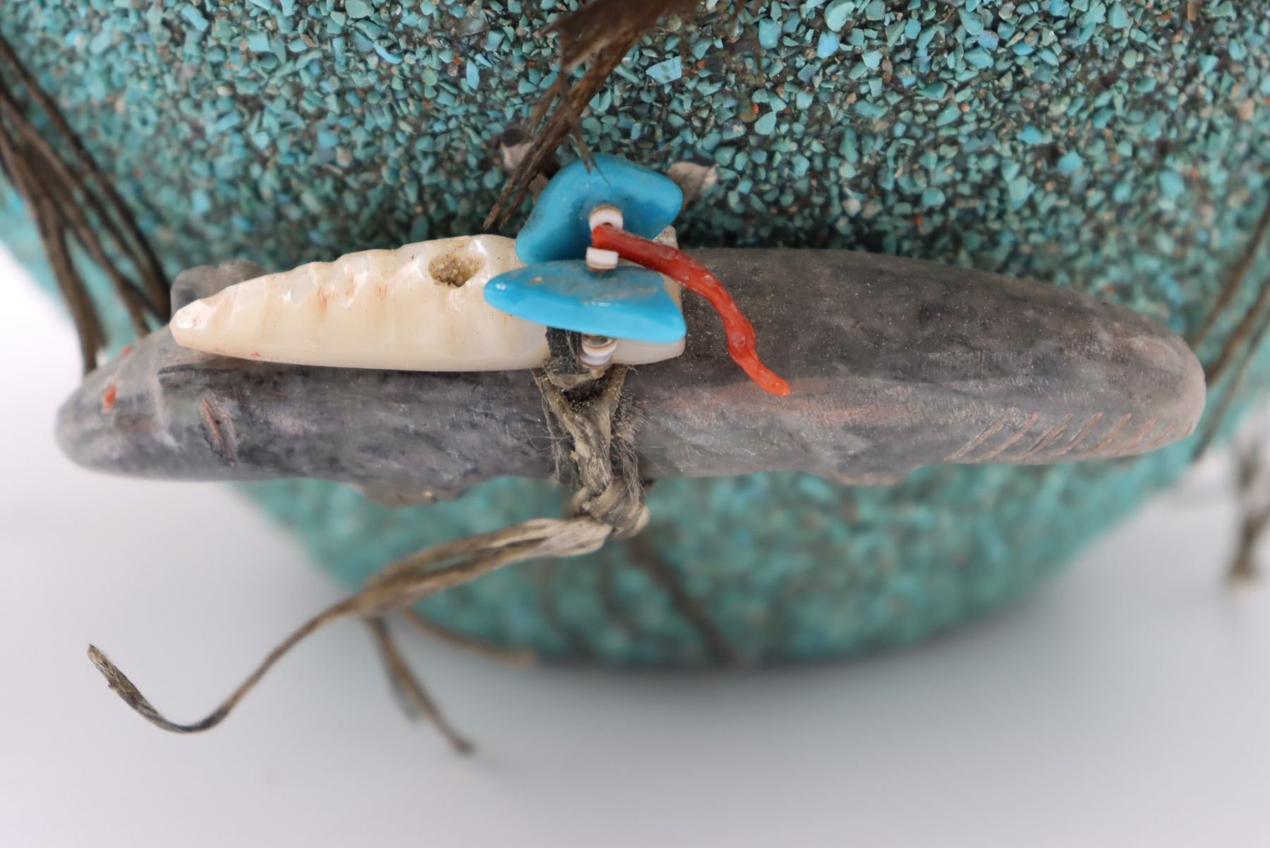 Southwestern American Indian decorated bowl by Edna Leki, adorned with crushed turquoise chips and eight very large Zuni fetish carvings with feathers, each attached to the vessel with sinew.