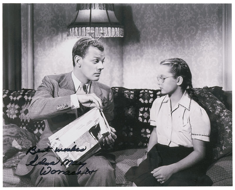 Two satin-finish photos, one 8 x 10 of the young actress conversing with director Alfred Hitchcock, and a 10 x 8 of Wonacott during a scene from Hitchcock’s Shadow of a Doubt, her first film, both signed in black felt tip, “Best Wishes, Edna May Wonacott.” In overall fine condition.