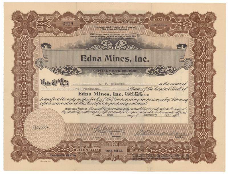 1926, Colorado. Stock certificate for 10,000 shares. Brown/Black. Archival tape repair on folds. Fine.