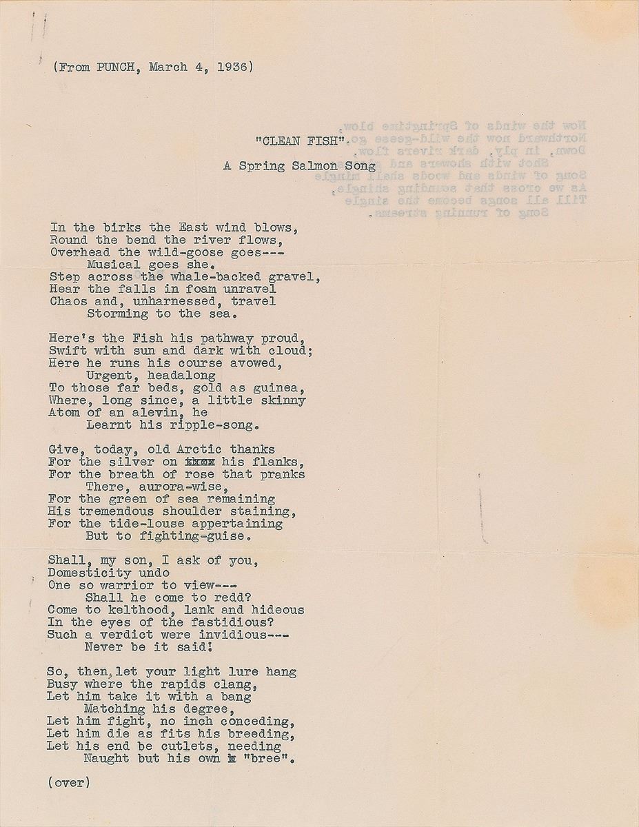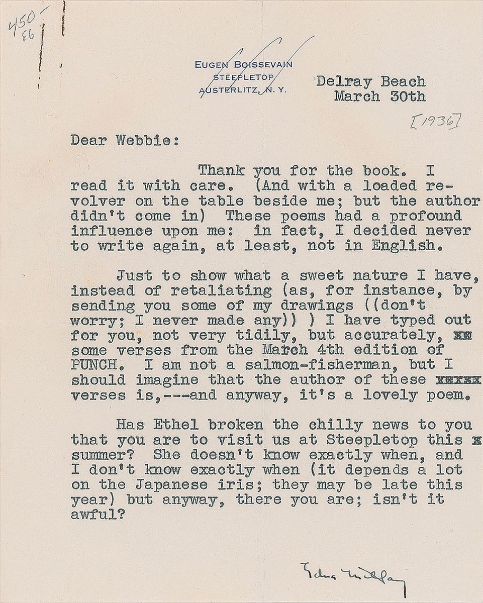 TLS signed “Edna Millay,” one page, 5.25 x 6.5, March 30, [1936]. Letter to H. J. Webster, in part: “Thank you for the book. I read it with care, (And with a loaded revolver on the table beside me; but the author didn’t come in) These poems had a profound influence upon me: in fact, I decided never to write again, at least, not in English. Just to show what a sweet nature I have, instead of retaliating (as, for instance, by sending you some of my drawings ((don’t worry; I never made any)) ) I have typed out for you, not very tidily, but accurately, some verse from the March 4th edition of Punch. I am not a salmon-fisherman, but I should imagine that the author of these verses is, —and anyway, it’s a lovely poem.” Included is the aforesaid poem, entitled ‘Clean Fish: A Spring Salmon Song. In fine condition. Accompanied by the original mailing envelope, addressed in Millay’s own hand, as well as a telegram from Millay to Webster, dated June 22, 1936, concerning a possible visit, and a postcard directing all future telegrams to Millay will be delivered via telephone.