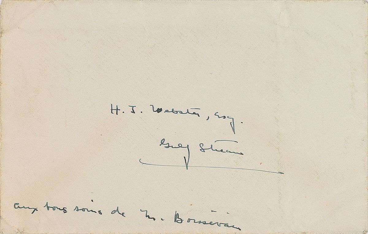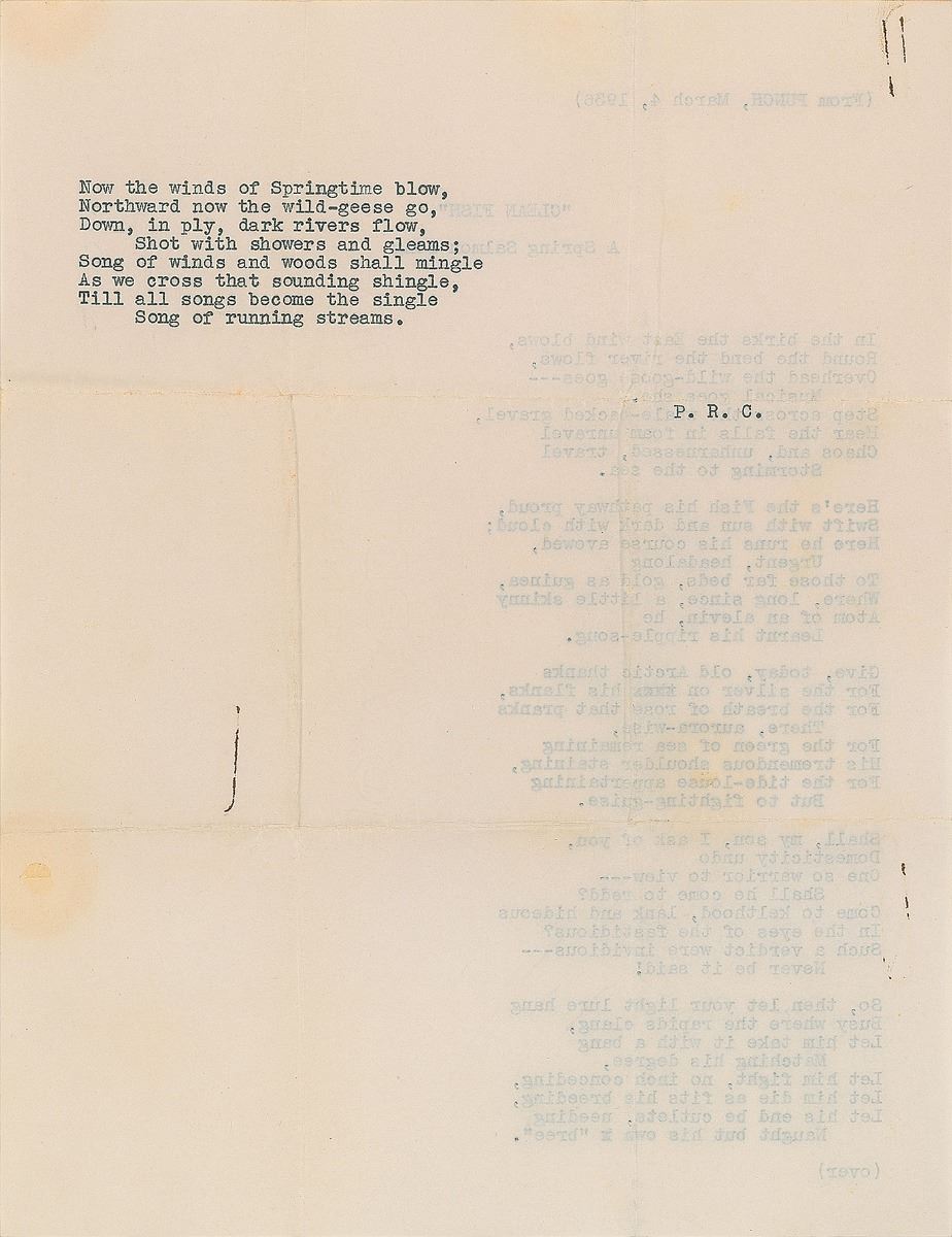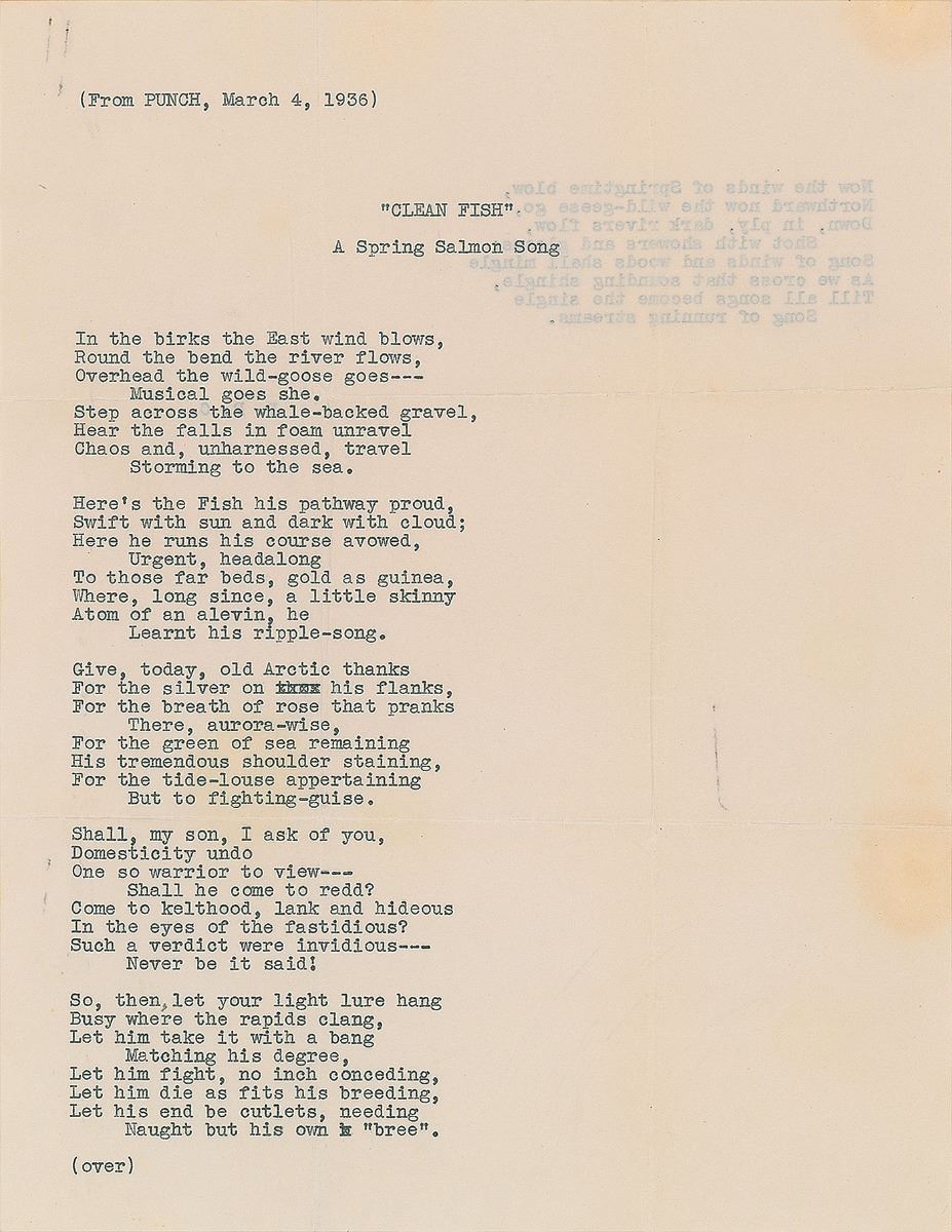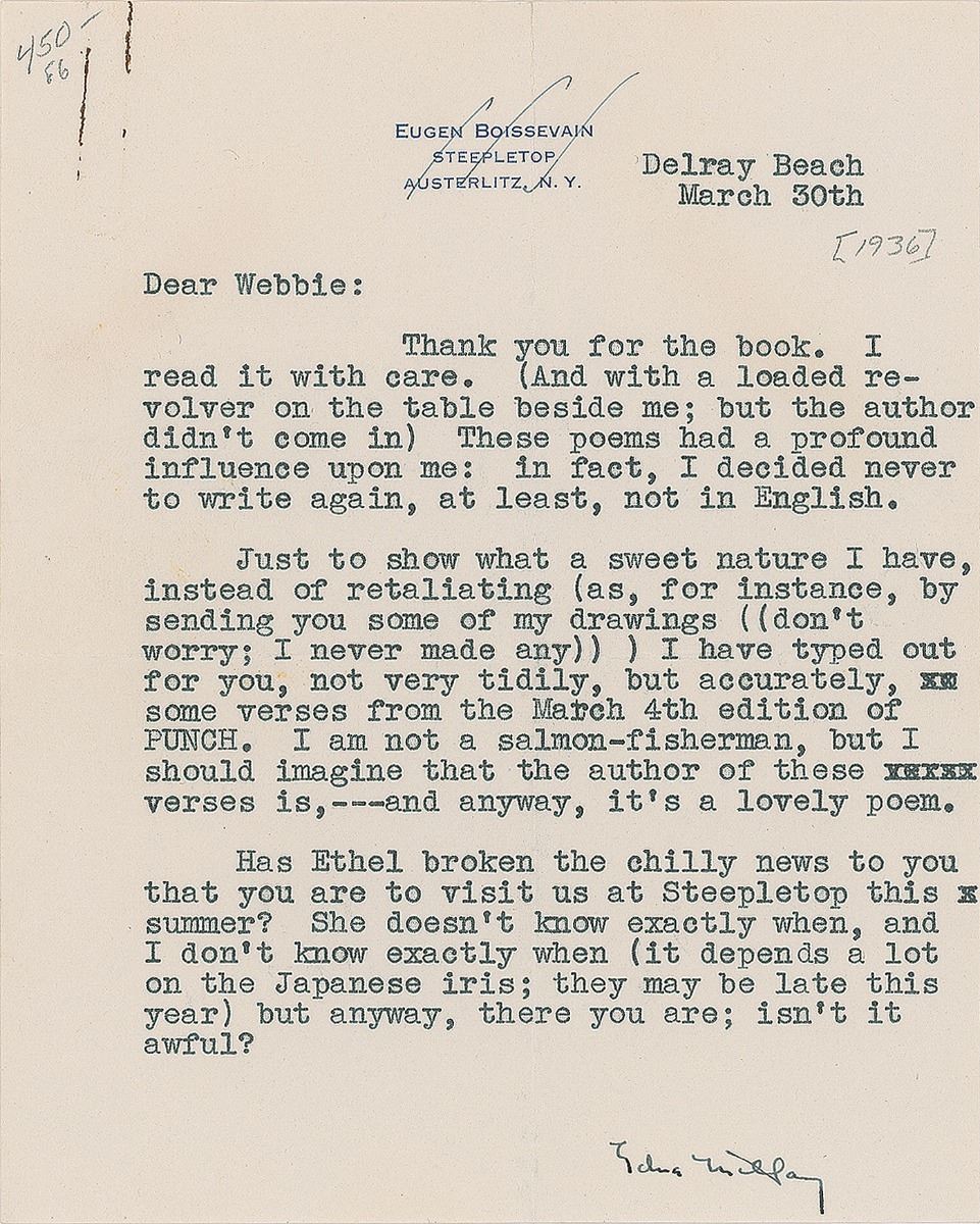 TLS signed “Edna Millay,” one page, 5.25 x 6.5, March 30, [1936]. Letter to H. J. Webster, in part: “Thank you for the book. I read it with care, (And with a loaded revolver on the table beside me; but the author didn’t come in) These poems had a profound influence upon me: in fact, I decided never to write again, at least, not in English. Just to show what a sweet nature I have, instead of retaliating (as, for instance, by sending you some of my drawings ((don’t worry; I never made any)) ) I have typed out for you, not very tidily, but accurately, some verse from the March 4th edition of Punch. I am not a salmon-fisherman, but I should imagine that the author of these verses is, —and anyway, it’s a lovely poem.” Included is the aforesaid poem, entitled ‘Clean Fish: A Spring Salmon Song. In fine condition. Accompanied by the original mailing envelope, addressed in Millay’s own hand, as well as a telegram from Millay to Webster, dated June 22, 1936, concerning a possible visit, and a postcard directing all future telegrams to Millay will be delivered via telephone.
