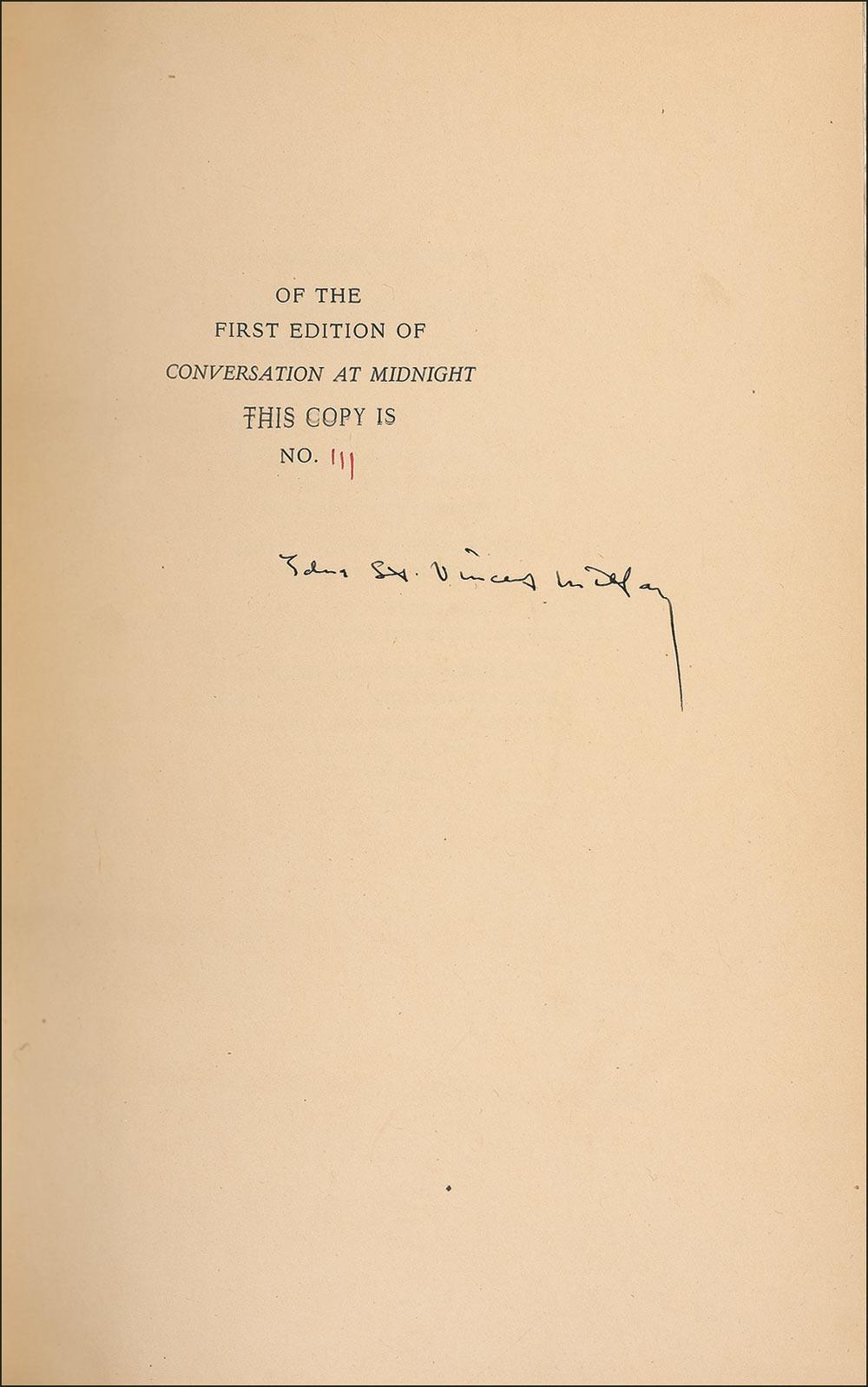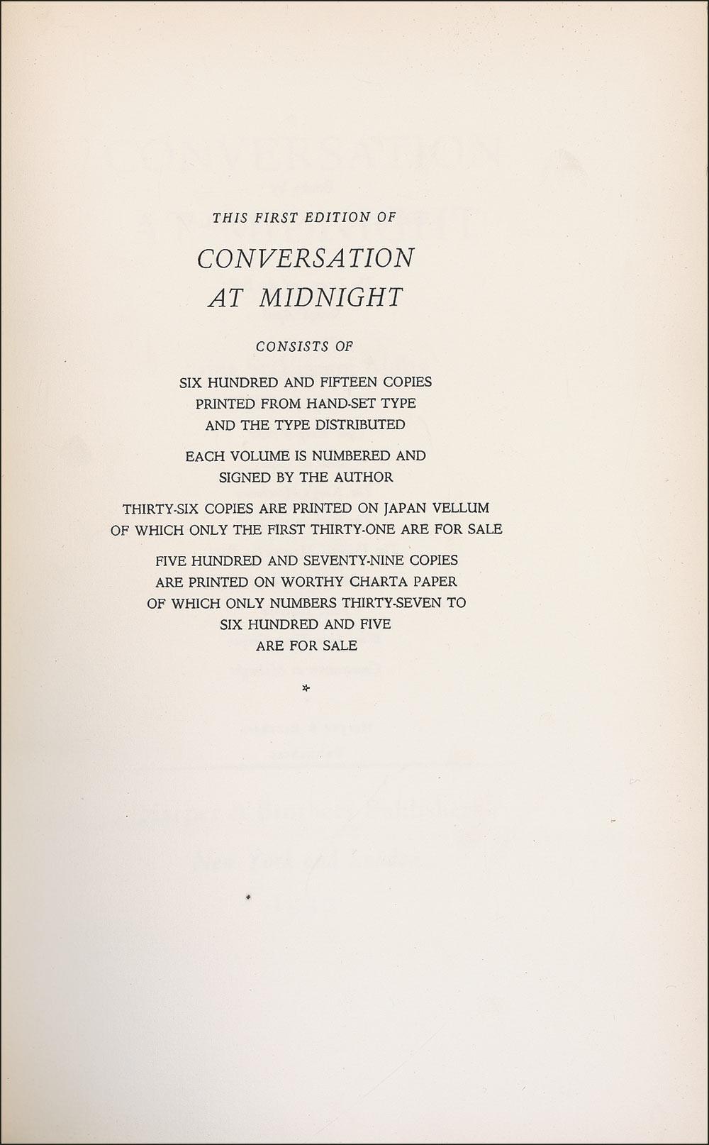 Signed book: Conversation at Midnight. Limited edition first edition of 1,650 copies (this copy No. 111). NY: Harper & Brothers Publishers, 1937. Hardcover with slipcase, 6.75 x 10.25, 177 pages. Signed in black fountain pen on the limitations page. In fine condition, with mild toning and soiling to the spine, and mild to moderate toning and wear to the slipcase. Pre-certified PSA/DNA and RRAuction COA.