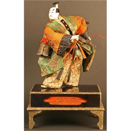 A spectacular early 19th Century Edo Period Takeda Ningyo in superb condition, a rare find in this condition. It is of the most elegant, for sure. He is an actor portraying a young Samurai. He has a beautifully carved face and wears sumptuous brocades. He has all of his original accessories, including a suit of armor on his back. He is positioned an a black lacquered stand on four legs. Total height is 20 inches. Figure height is 14 inches. Excellent Condition.