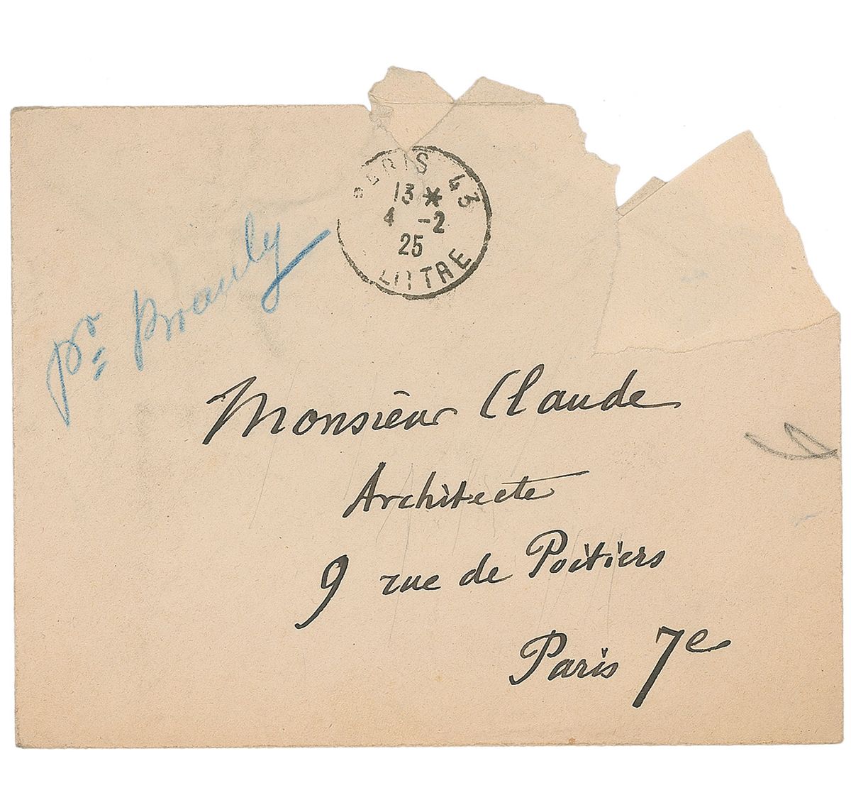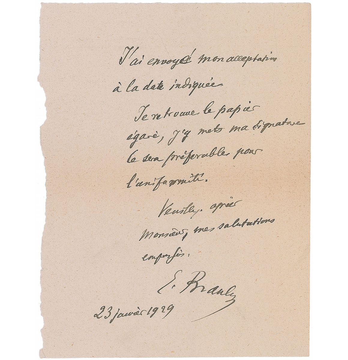 French inventor (1844–1940) primarily known for his involvement in wireless telegraphy. ALS in French, signed “E. Branly,” one page, 4.5 x 6, January 23, 1929. Untranslated letter to “Monsieur Claude.” Accompanied by the original mailing envelope. In fine condition, with paper loss along left edge and some scattered mild toning.