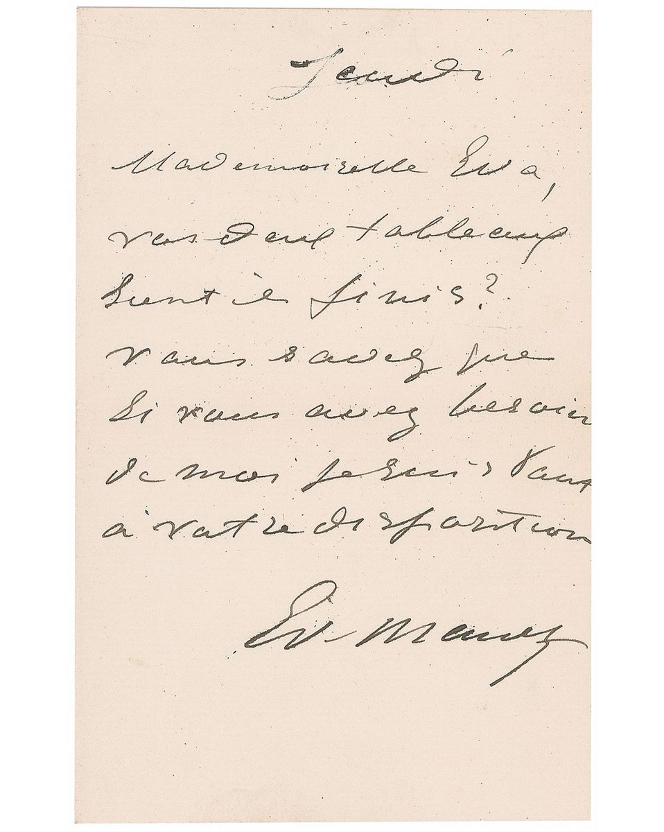 Important 19th century French painter (1832–1883) whose works, including such well-known images as ‘The Luncheon on the Grass’ and ‘Olympia,’ were a seminal influence on the impressionists of the succeeding generation. ALS in French, signed “Ed. Manet,” one page, 3.75 x 6, no date, but postmarked Paris, April 19, 1877. A subtly flirtatious letter to Eva Gonzales, in full (translated): “Are your two pictures finished? You know that if you need me, I am entirely at your disposal.” In fine condition. Accompanied by the original mailing envelope addressed in Manet’s hand. A well-known Impressionist painter herself, Eva Gonzalez was Manet’s one and only formal pupil, and as such enjoyed his focused attention. The two maintained a lively relationship and shared regular correspondence, which have grown increasingly difficult to find. Connecting two important figures of the movement, this is a charming letter from the Impressionist leader to his young pupil.