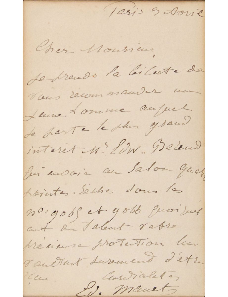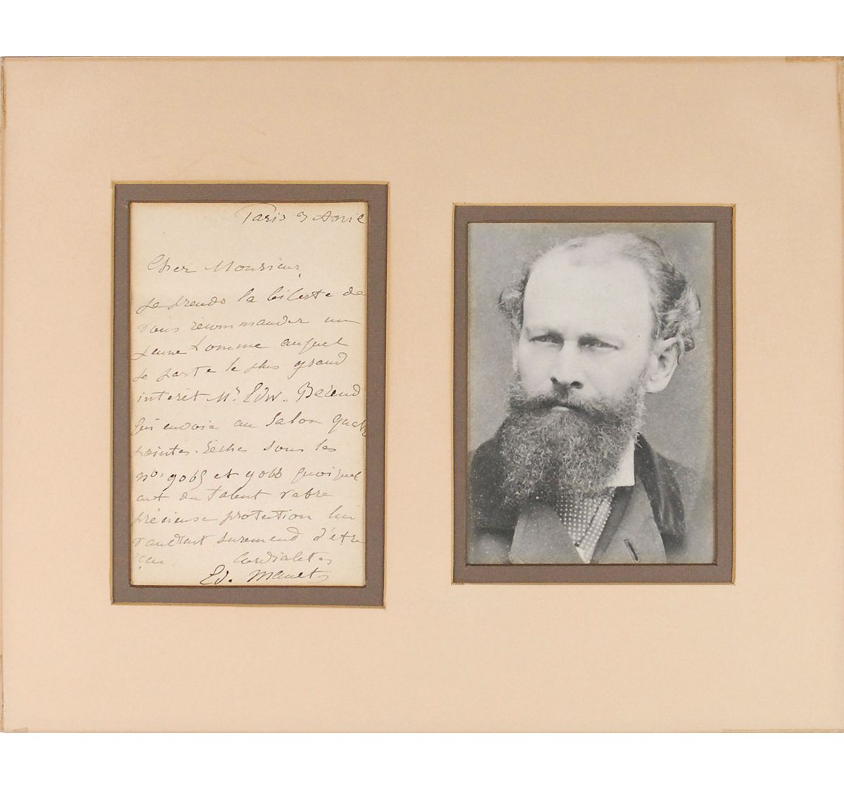 Important 19th century French painter (1832–1883) whose works were a seminal influence on the impressionists of the succeeding generation. ALS in French, signed “Ed. Manet,” one page, 4.25 x 6.5, April 3, no year. An untranslated letter of introduction for a young man to gain admittance to an upcoming Salon. Double-matted with a portrait of Manet to an overall size of 15 x 12. In fine condition, with light uniform toning. ‘Salon’ exhibitions were frequently mounted in France during this period, the most famous of which was the annual Paris Salon, the official art exhibition of the Académie des Beaux-Arts. Manet’s nude entitled ‘Olympia,’ was first exhibited at the Paris Salon in 1865, where it shocked the world due to its frank depiction of a prostitute—today, this is considered a watershed moment in modern artistic history.