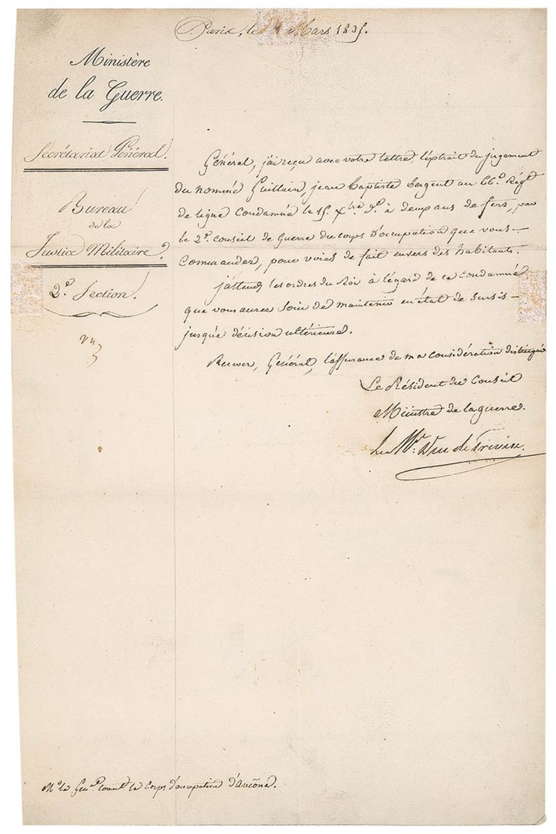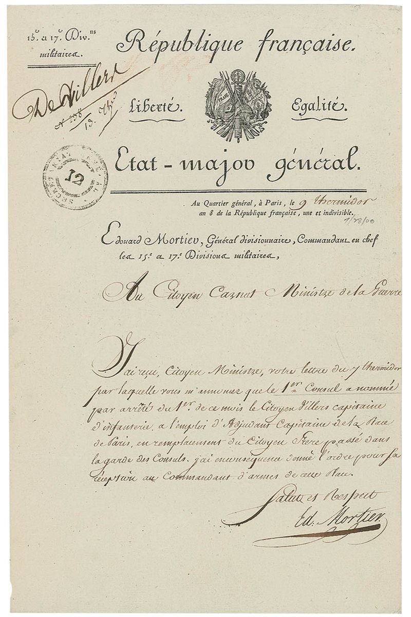 French general and Marshal of France under Napoleon (1768–1835). Two letters. LS, in French, signed Ed. Mortier,” one page, 8 x 12.5, July 27, 1800. Letter to Lazarne Carnot, Minister of War. In part (translated): “I received, Citizen Minister, your letter of 7 thermidor informing me that the First Consul has named…Citizen Villers Captain of lnfantry…as Adjutant…replacing Citizen Frere who has entered into the Consular Guard.” LS, in French, signed “Le Mal. Duc de Trevise, one page, 8 x 12.5, March 4, 1835, just one week before his assassination. In part (translated): “General, I received news of the verdict against Jean-Baptiste Guillan, Sergeant in the 6601 Regiment of the Line sentenced to two years in chains by the 2nd Council of War of the Occupation Corps you command for his acts of assault and battery against the inhabitants…I am Waiting for the King’s orders concerning the condemned man.” In fine condition, with intersecting folds to both, as well as some scattered mild toning and soiling.