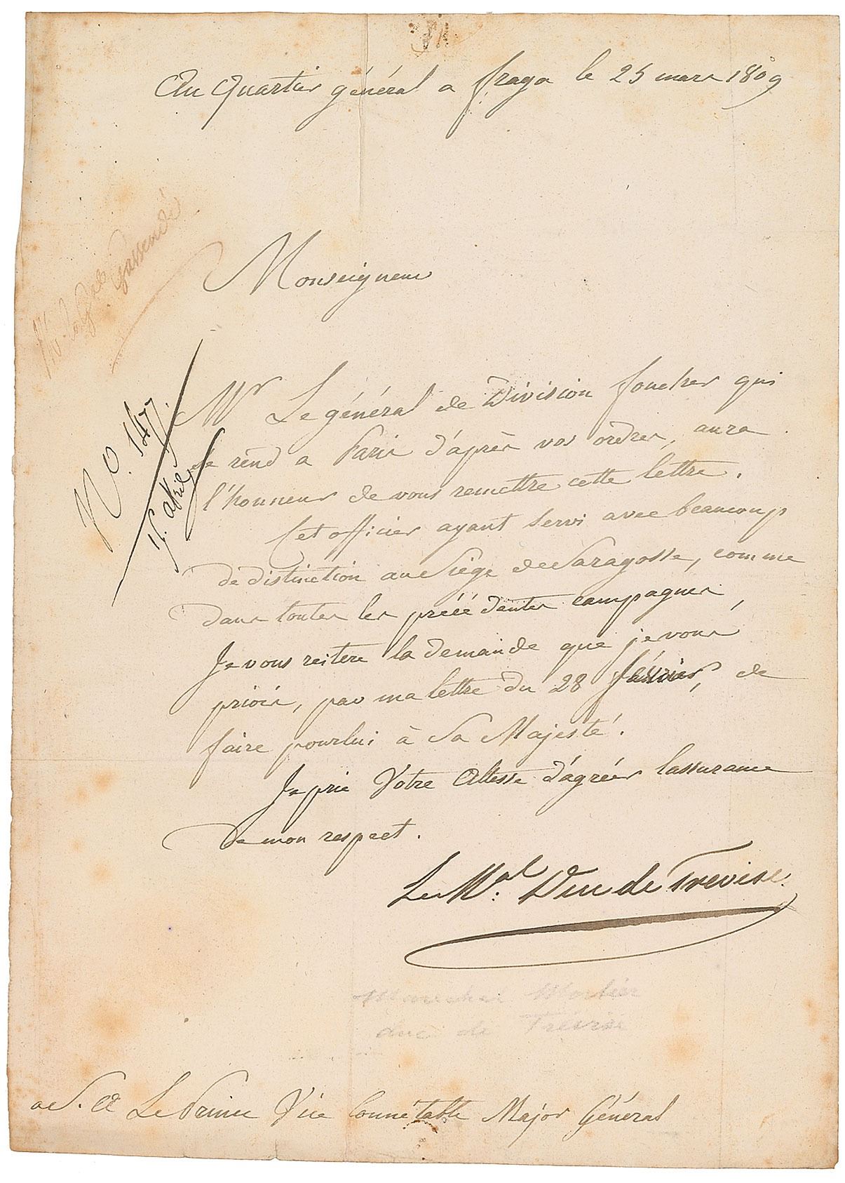 LS in French, signed “Le M'al Duc de Trevise,” one page, 8.5 x 11.75, May 25, 1809. Letter to Prince Berthier, in part (translated): "General Foucher, who is going to Paris according to your orders, will have the honor of handing you this letter. This officer having served with great distinction at the Siege of Zaragoza, as in all the preceding campaigns, I repeat to you the request that I will ask you by my letter of February 28, to do for him to His Majesty." In fine condition, with scattered light toning.