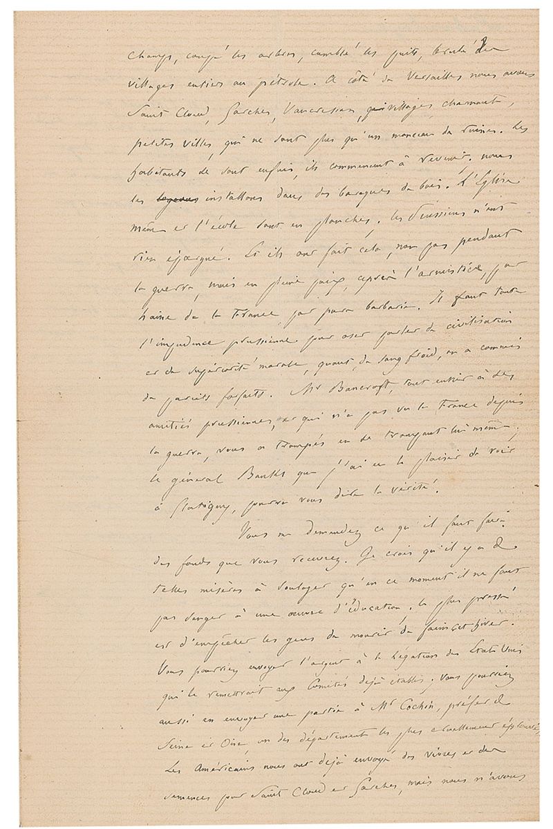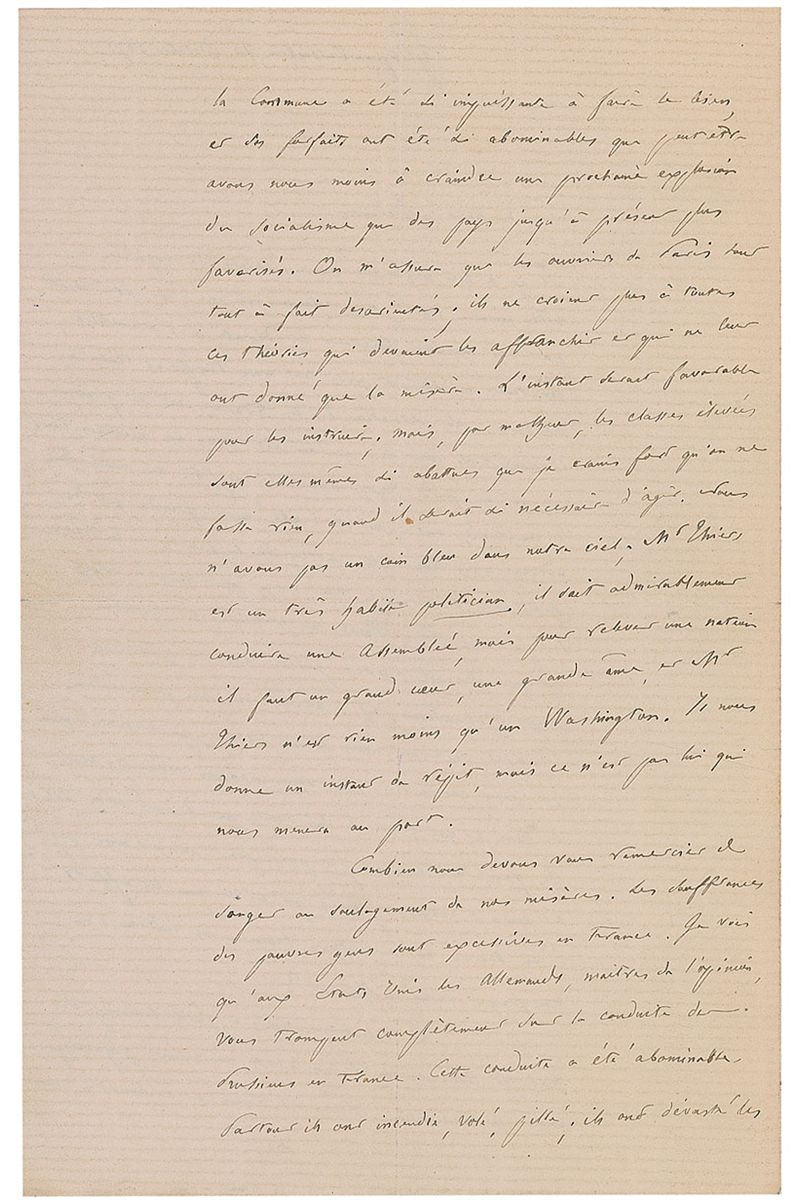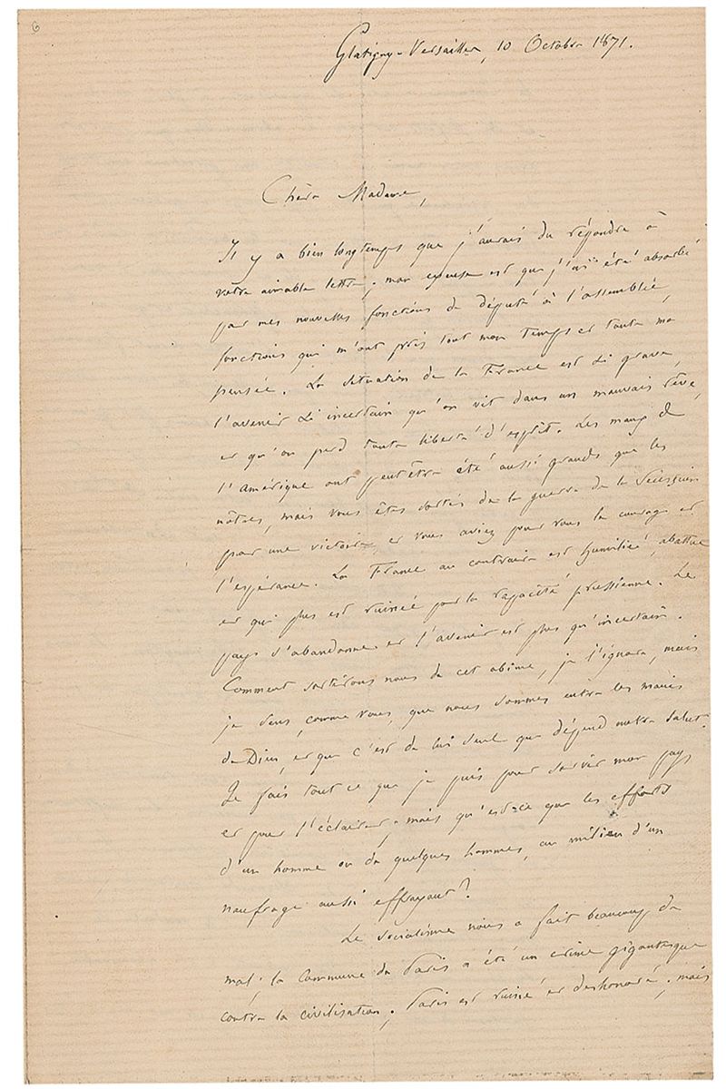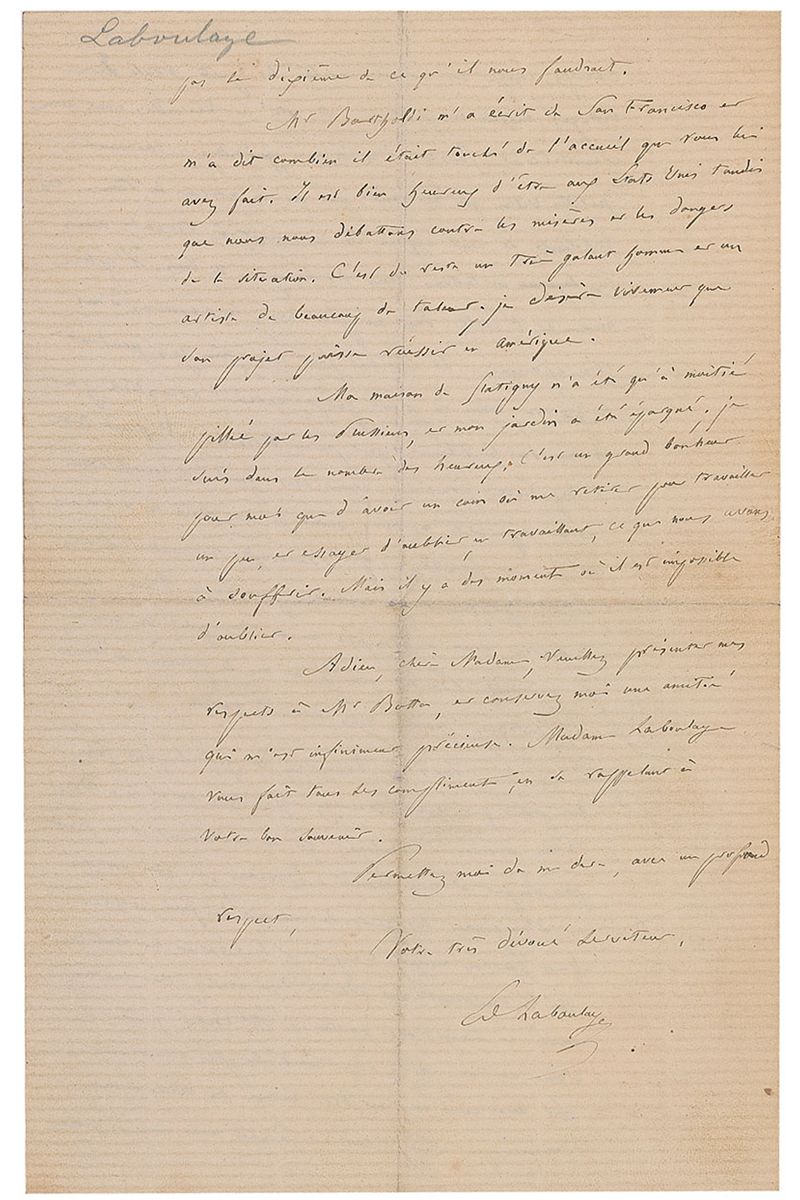 ALS in French, signed “E. Laboulaye,” four pages on two adjoining sheets, 5.25 x 8.25, October 10, 1871. Letter to a lady. In part (translated): “The situation in France is so serious, future so uncertain that we are living a bad dream, and we lose all independence of mind. Maybe the pains in America have been as important as ours, but you are out of the secession war by a victory and you had courage and hope on your side. France on the contrary is humiliated, demoralized, and even more ruined by the Prussian rapacity. The country gives up and future is more than uncertain. How will we get out of this abyss, I do not know, but I feel as you do that we are in God’s hands, and our salvation depends upon him only…How much we should thank you to have in mind relieving our miseries. Poor people of France are suffering excessively…Next to Versailles we have Saint Cloud, Garches, Vaucresson, charming villages, small towns that are nothing but a pile of rubbles. People fled, they are starting to come back; we put them up in wooden shacks. The church even the school are all planks; the Prussians did not spare a thing. And they did that, not during the war, but in full peace, after the armistice, for hatred of France, not by barbarity. It takes the whole impudence of Prussians to dare talk about civilization and superiority of morals, when in cold blood they have committed such crimes…You ask me what should be done with the funds that you are receiving. I think that there is such poverty to relieve that this is not the time to think about charity for education; the most pressing is to prevent people from starving to death this winter…Mr. Bartholdi wrote me from San Francisco and told me how much he was touched by the welcome you extended to him. He is very happy to be in the United States while up here we are struggling with the poverty and dangers of the situation. In fact, he is a very gallant man and an artist with a lot of talents; I truly wish that his project can succeed in America.” In fine condition, with central vertical and horizontal folds and subtle toning.