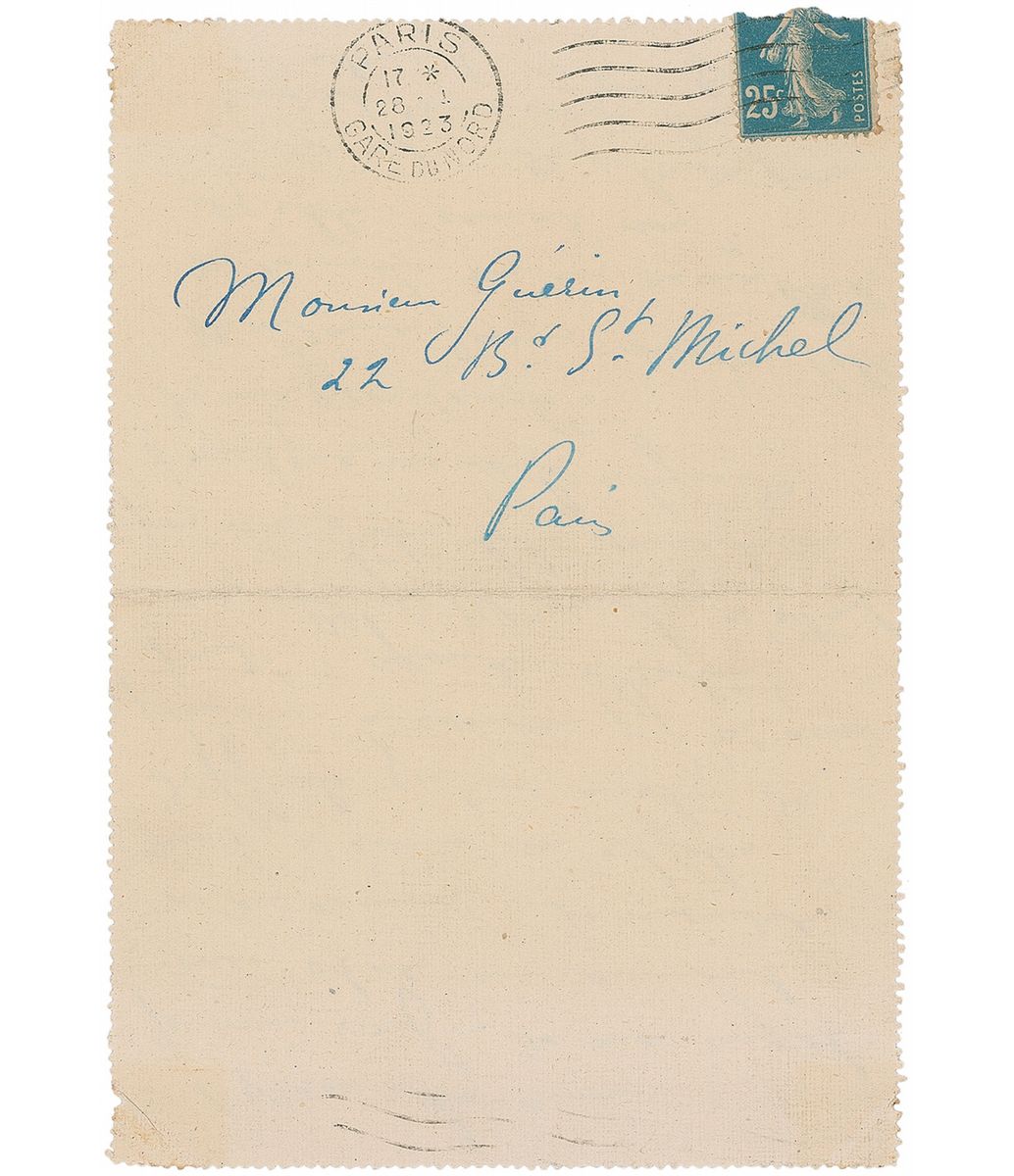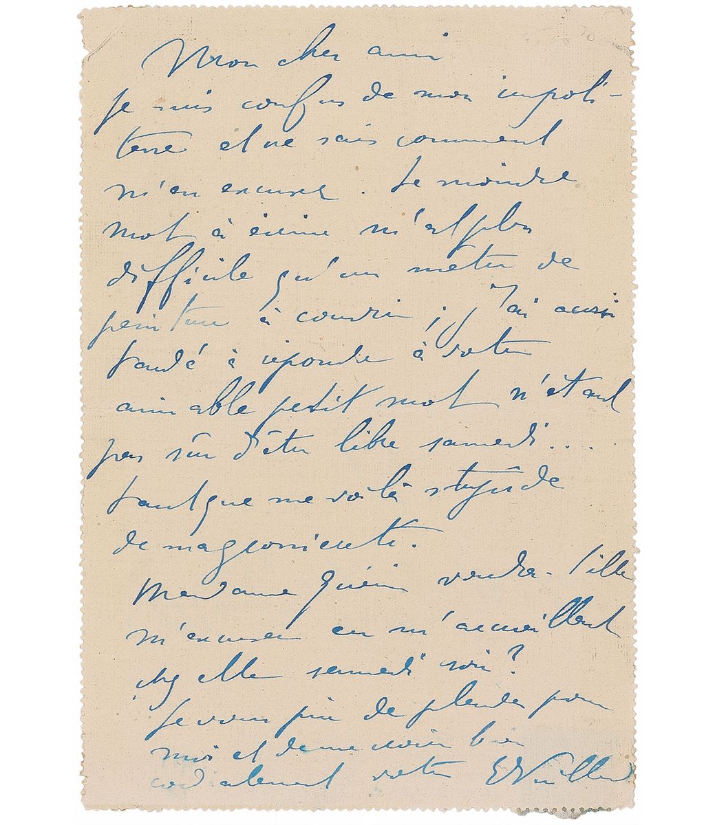 French painter and printmaker (1868–1940). ALS in French, signed “E. Vuillard,” one page, 4.25 x 6.25, no date but postmarked January 28, 1923. Untranslated letter apologizing for his rudeness (seemingly a delay in responding to a letter), and extending an invitation for a later date. In fine condition, with creases to upper corners.