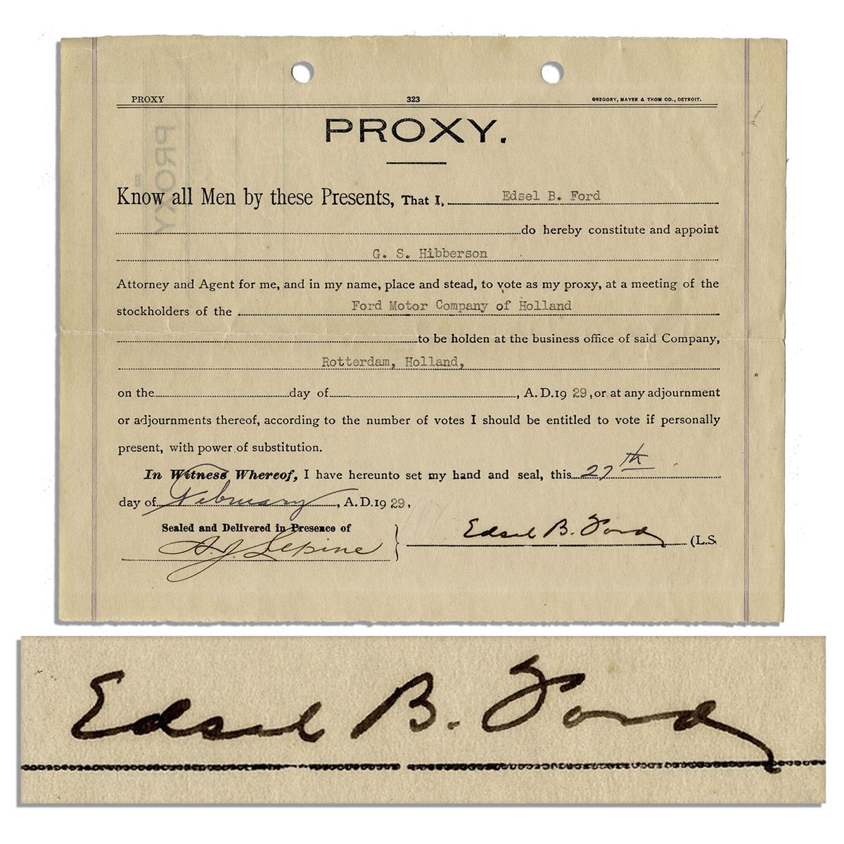 Document signed by Edsel Ford as President of Ford Motor Company. Dated 27 February 1929 and signed ''Edsel B. Ford'' in ink, ''proxy'' document appoints G.S. Hibberson to vote in his stead at a stockholders meeting in Rotterdam, Holland. Accompanied by an identical document dated 11 March 1929 and signed by Henry Ford's wife, ''Clara J. Ford''. Measures 8'' x 6.25''. Toning, slightly irregular bottom edge and punch holes to top edge of Edsel Ford document, else near fine.