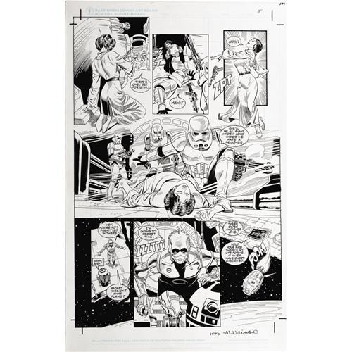 <B>Eduardo Barreto and Al Williamson - Star Wars: A New Hope - The Special Edition #1, page 5 Original Art (Dark Horse, 1997).</B></I> Storm troopers subdue Princess Leia, while R2-D2 and C-3PO make their escape, in this page from the first issue of <B>Star Wars: A New Hope</B></I>. The image area measures 11" x 16", and the condition is Excellent. Signed by Al Williamson at the bottom right.<BR><BR><b>Shipping:</b> Large Flat (<a target="_blank" href="http://www.heritageauctions.com/common/shipping.php">view shipping information</a>)