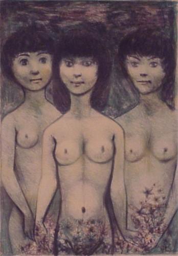 Eduardo Goerg (1893-1969) Austrian THREE GRACES, color lithograph, signed in pencil, from the numbered edition 200, image 17 x 12", full margins, framed with glass, toned, minor foxing speckles bottom area.