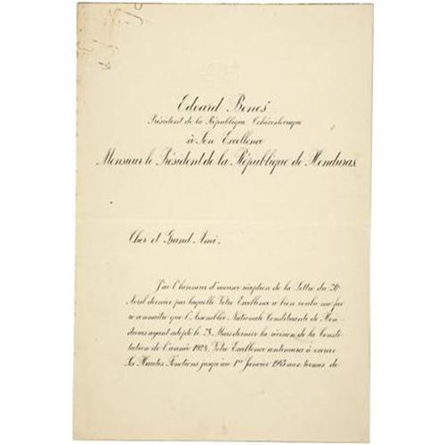 <B>Edvard Benes, President of Czechoslovakia, Document Signed,</B></I> four integral pages written on pages one and two, 8.5" x 12.5", Prague, July 31, 1936, in French. A couple of small insect hole and rust stains from paperclips at the top, else near fine. Sold with a postal card featuring Benes. The document is addressed to the president of the Republic of Honduras and signed by Edvard Benes as president of Czechoslovakia.<BR><BR><BR><b>Shipping:</b> Flat Material, Small (<a target="_blank" href="http://www.heritageauctions.com/common/shipping.php">view shipping information</a>)