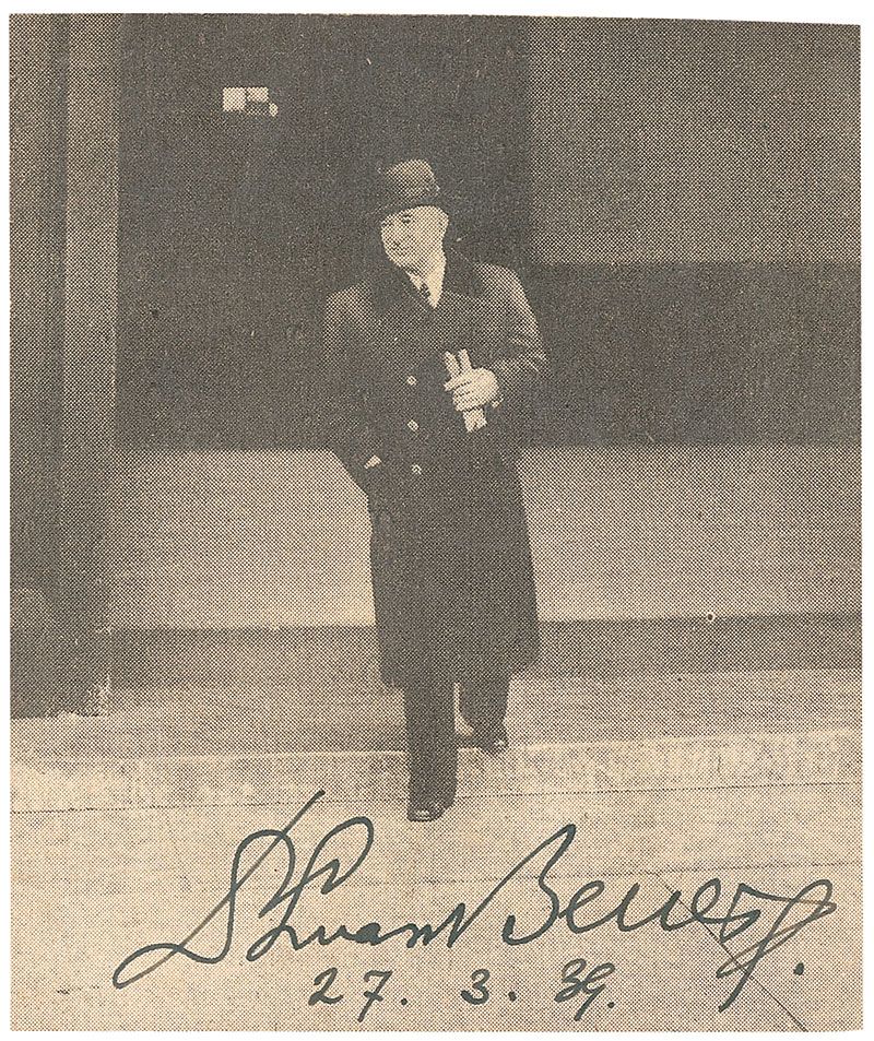 Leader of the Czechoslovak independence movement (1884–1948) who was President of Czechoslovakia at the time of Hitler’s incursion. Vintage 4.5 x 5.25 paperstock photo of Benes exiting a building, signed at the bottom of the image in black ink and dated March 27, 1939. Affixed to a larger sheet that also bears a Czechoslovakian postage stamp to an overall size of 8 x 10.75. In fine condition.