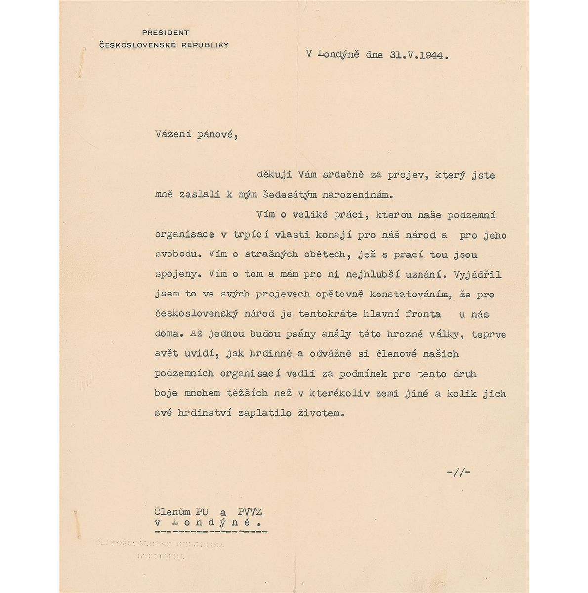 Leader of the Czechoslovak independence movement (1884–1948) who was President of Czechoslovakia at the time of Hitler’s incursion. Untranslated TLS in Czech, signed “Dr. E. Benes,” two pages, 8 x 10, president of the Czech Republic letterhead, May 31, 1944. Central vertical and horizontal folds, small edge separations, and staple holes to the upper left.