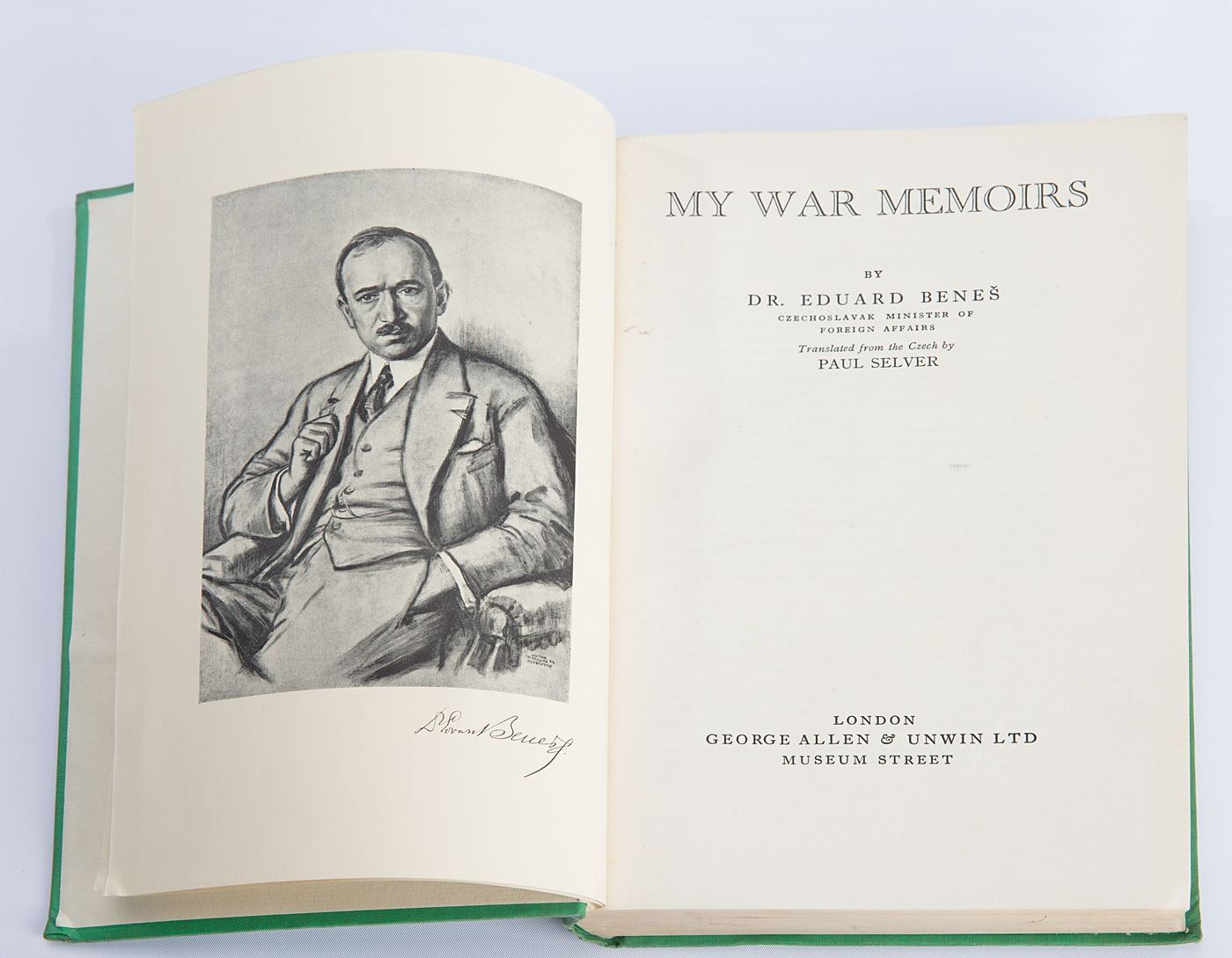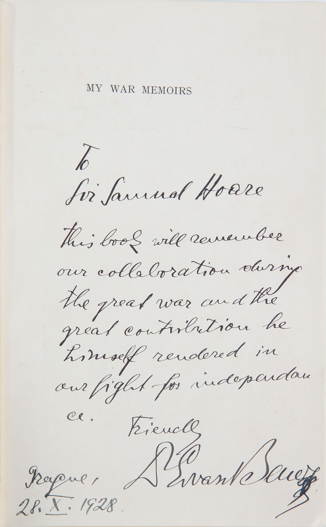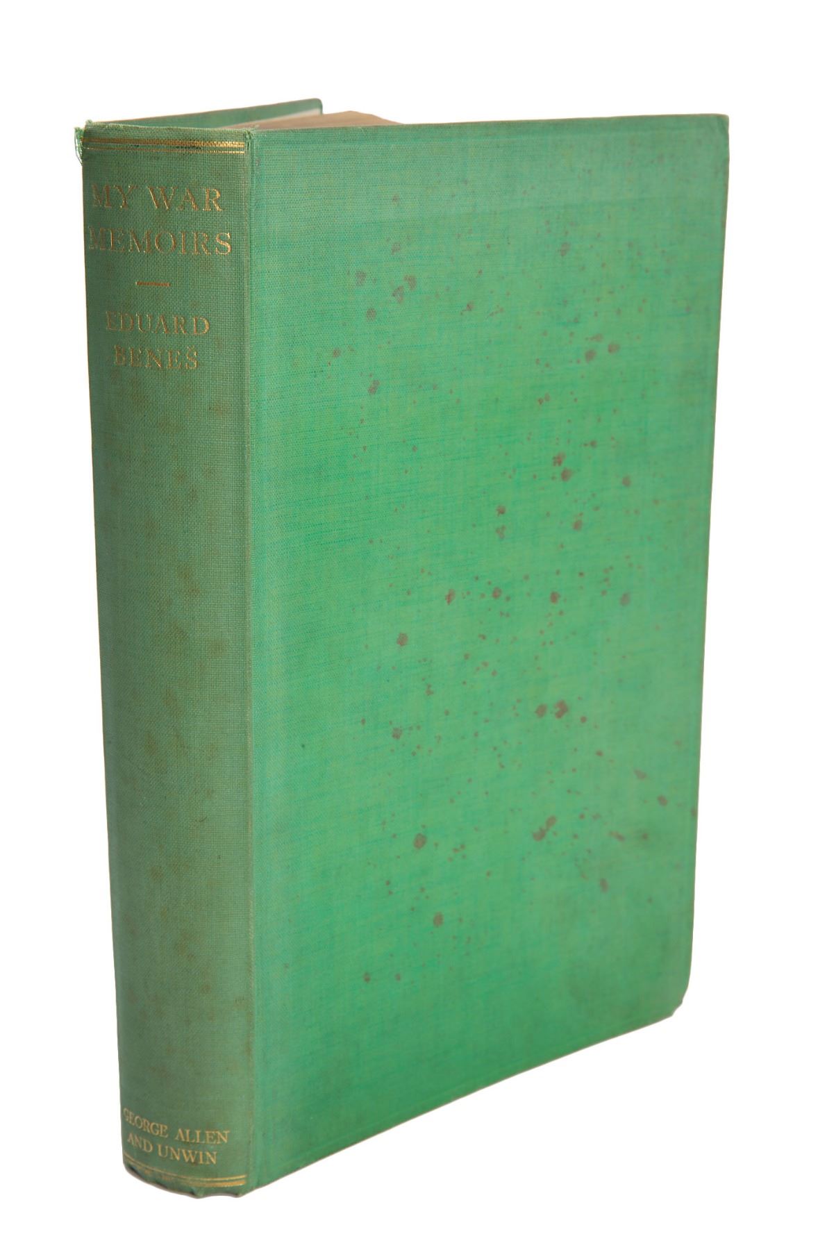 Leader of the Czechoslovak independence movement (1884–1948) who was President of Czechoslovakia at the time of Hitler's incursion. Signed book: My War Memoirs. First English edition. London: George Allen & Unwin, 1928. Hardcover, 6.5 x 9.75, 512 pages. Boldly signed and inscribed on the half-title page in fountain pen, "To Sir Samuel Hoare, this book will remember our collaboration during the great war and the great contribution he himself rendered in our fight for independence. Friendly, Dr. Edvard Benes, Prague, 28.X.1928." In very good to fine condition, with staining and bowing to the covers, and the boards slightly bowed; inner pages are fine. Sir Samuel Hoare, 1st Viscount Templewood, was a British conservative politician with close ties to the Czech government who had served in the British Army during World War I. A marvelous association copy of Benes's wartime memoir.