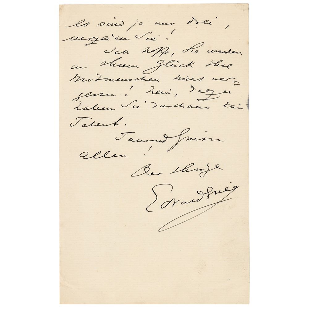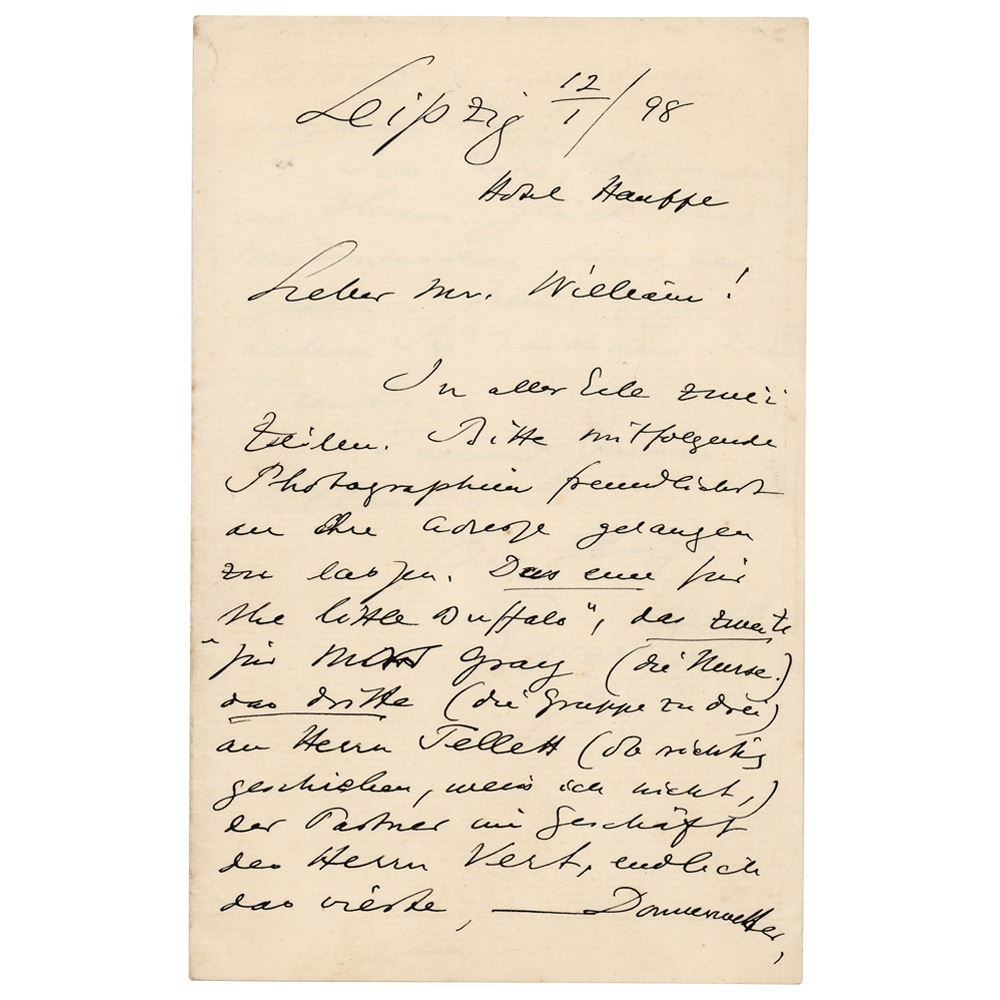 Important Norwegian composer and pianist (1843-1907) whose works, often with a strong nationalistic flavor, include such repertory staples as the 'Piano Concerto in A minor,' the incidental music to Peer Gynt, and the 'Holberg Suite.' ALS in German, two pages on two adjoining sheets, 4.5 x 7.25, January 12, 1898. Addressed from Leipzig, a handwritten letter to William, in part (translated): "Writing you a few words in a hurry. Please get the photos to your colleague. The new one for the ‘little buffalo’. The second for Mrs. Grey (the nurse). The third to Mr. Tellett (if correctly sent) — the business partner of Mr. Vert. And finally the fourth…in fact, there are only three! I hope, with all your luck, you don’t forget your fellow men. No, you have absolutely no talent for that." In fine condition.