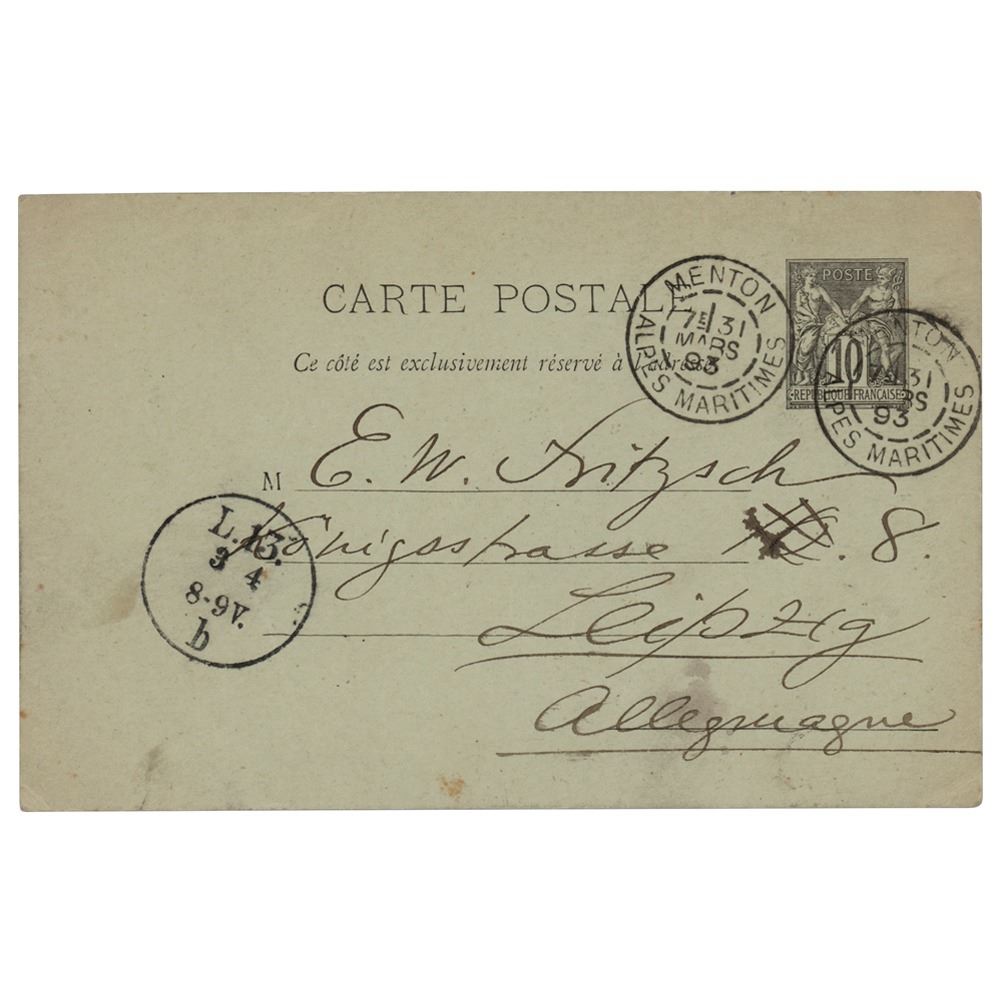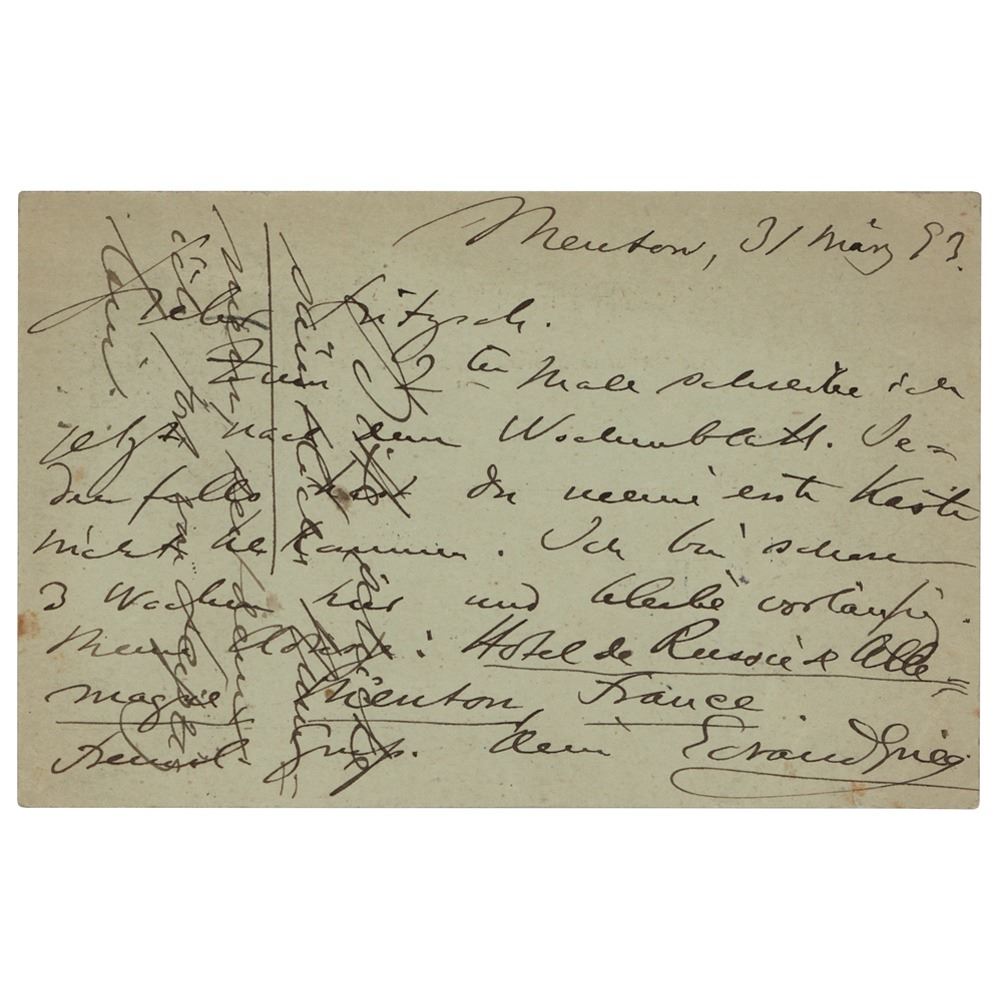 ALS in German, one page, 5.5 x 3.5, postcard letterhead, March 31, 1893. Untranslated handwritten letter to E. W. Fritzsch in Leipzig, addressed on the reverse in Grieg's own hand. In fine condition.