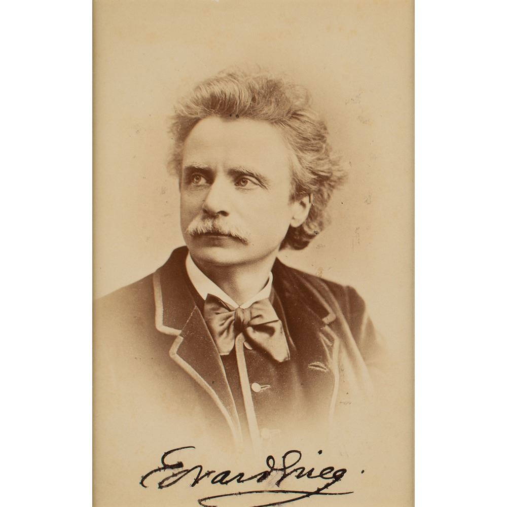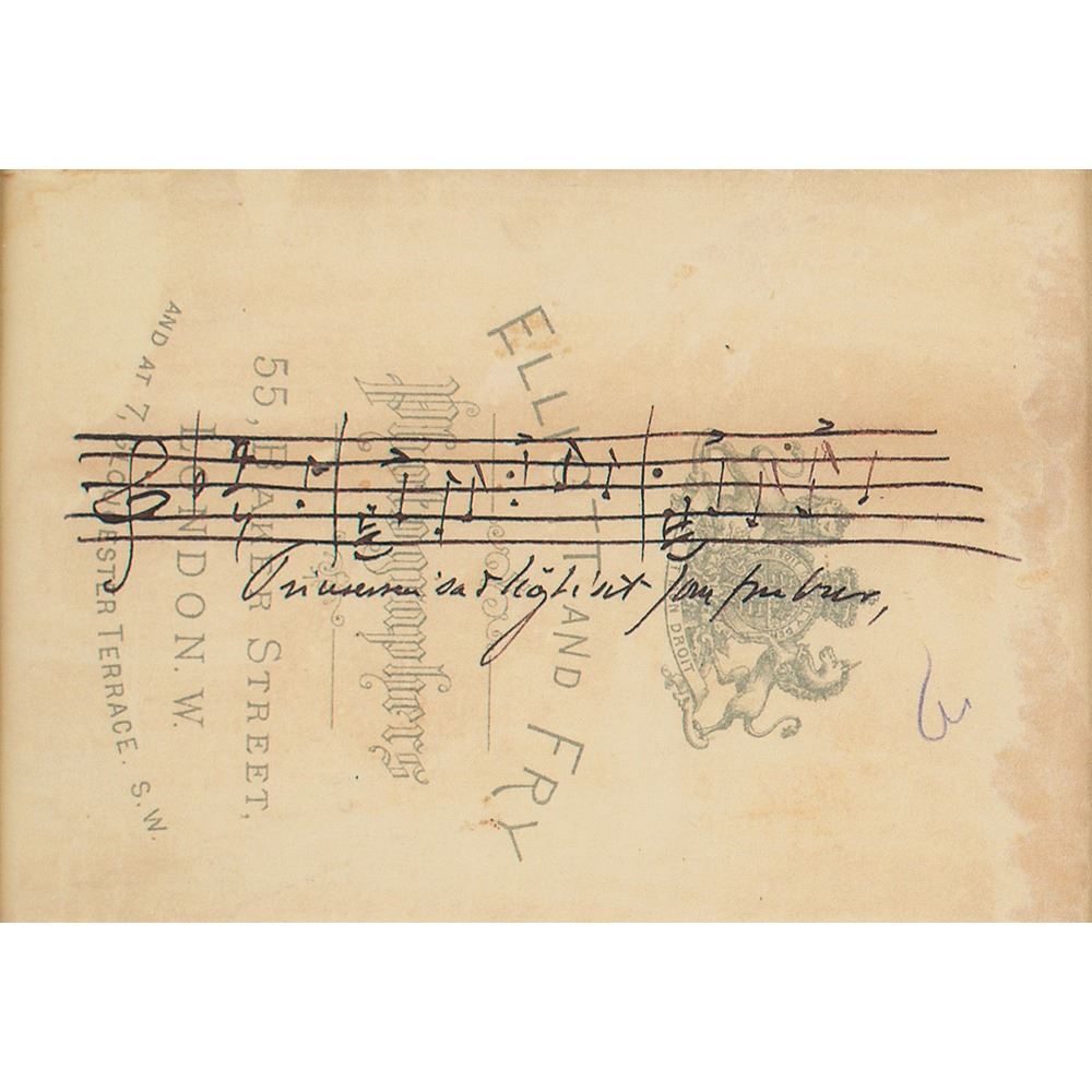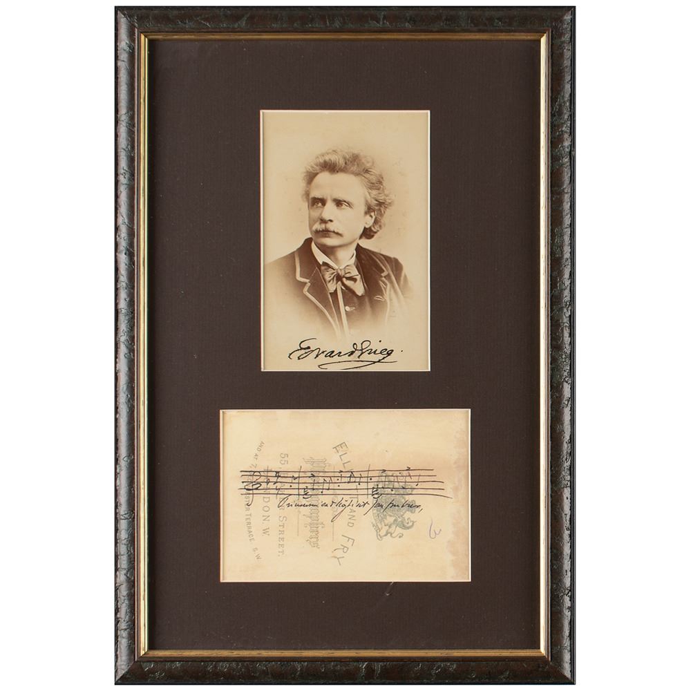 Important Norwegian composer and pianist (1843-1907) whose works, often with a strong nationalistic flavor, include such repertory staples as the 'Piano Concerto in A minor,' the incidental music to Peer Gynt, and the 'Holberg Suite.' Highly desirable 3.75 x 5.75 cabinet photo of Grieg by Elliott & Fry of London, boldly signed below the image in ink, "Edvard Grieg." On the reverse, Grieg has penned four bars of music from one of his works; matted and framed under Tru-Vue Conservation Clear with a color copy of the musical quotation to an overall size of 10.25 x 14.25. In very good to fine condition, with slight brushing to the signature on the front, and some toning and staining to the reverse.