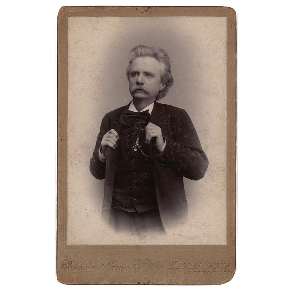 Highly sought-after 4.25 x 6.5 cabinet photo of Grieg in a stylish suit, signed on the reverse in black ink. Published by Christensen & Morange of Copenhagen. Also bears a notation of the collector's name on the reverse. In very good to fine condition, with light scuffing to the image, and some small stains and a corner crack to the signed side. Originates from the collection of American violinist and pianist Louis Persinger (1887–1966), who trained at the Leipzig Conservatory and later taught at Juilliard, mentoring the likes of Yehudi Menuhin, Ruggiero Ricci, and Isaac Stern.