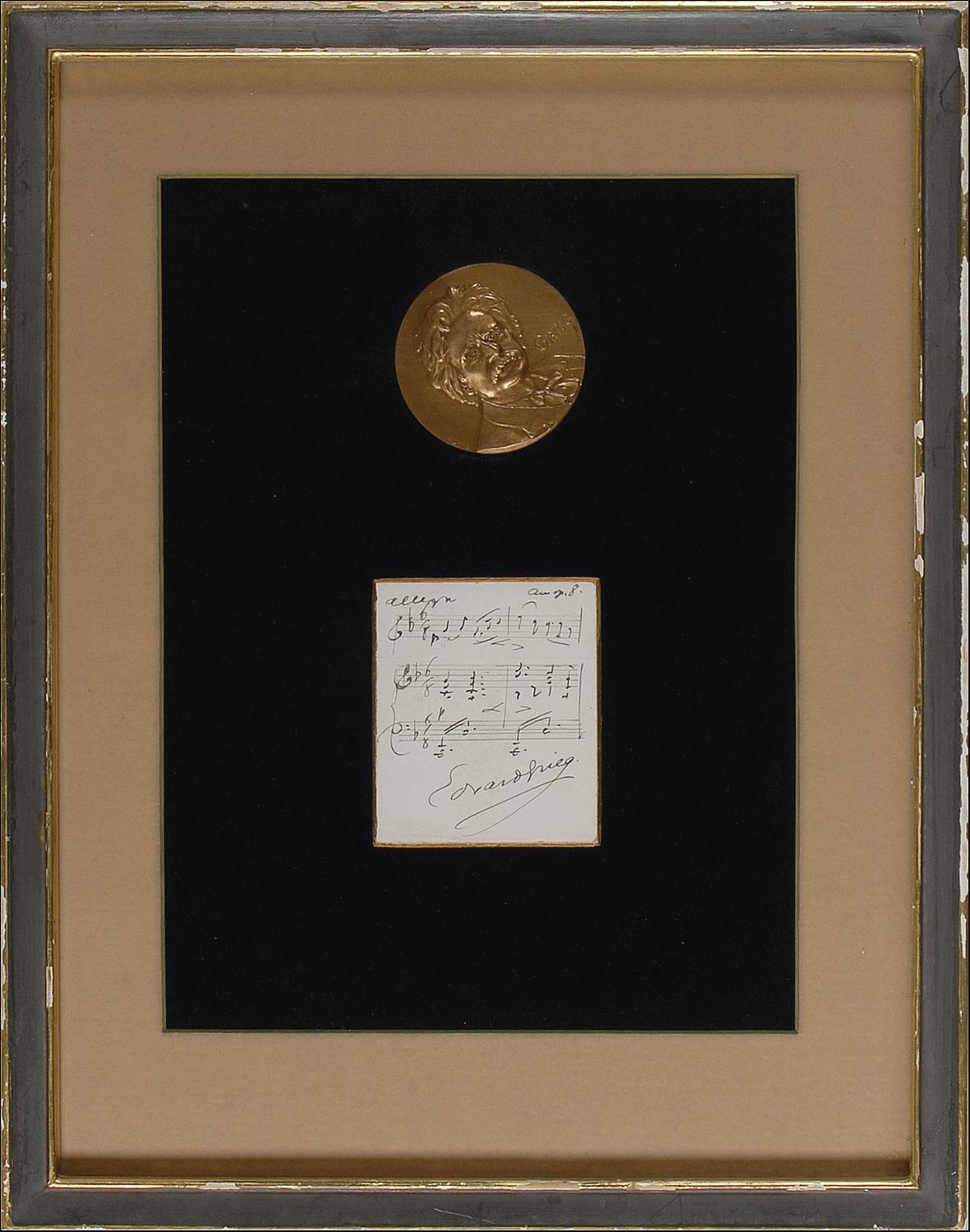 Important Norwegian composer and pianist (1843–1907) whose works, often with a strong nationalistic flavor, include such repertory staples as the ‘Piano Concerto in A minor,’ the incidental music to Peer Gynt, and the ‘Holberg Suite.’ Rare AMQS on an off-white 3 x 4.75 card, Grieg pens two measures from his ‘Violin Sonata No. 1 in F Major, Op. 8,’ signed at the bottom, “Edvard Grieg.” Quote is affixed to an identical size card. Matted and framed with a bronze portrait medal to an overall size of 13.5 x 17; the frame back bears the printed label and red wax seal of noted dealer Charles Hamilton. Faint soiling and fingerprints, otherwise fine condition. Grieg composed this sonata in 1865 when he was just 22, and it is one of three sonatas for violin and piano among his works. A desirable musical quotation dashed off with great panache, finished with an equally exuberant signature.