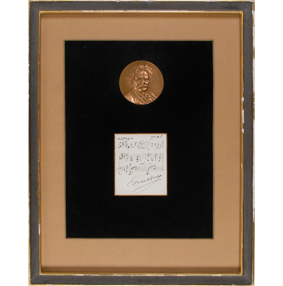 Rare AMQS on an off-white 3 x 4.75 card, Grieg pens two measures from his ‘Violin Sonata No. 1 in F Major, Op. 8,’ signed at the bottom, “Edvard Grieg.” Quote is affixed to an identical size card. Matted and framed with a bronze portrait medal to an overall size of 13.5 x 17; the frame back bears the printed label and red wax seal of noted dealer Charles Hamilton. Faint soiling and fingerprints, otherwise fine condition. Grieg composed this sonata in 1865 when he was just 22, and it is one of three sonatas for violin and piano among his works. A desirable musical quotation dashed off with great panache, finished with an equally exuberant signature.