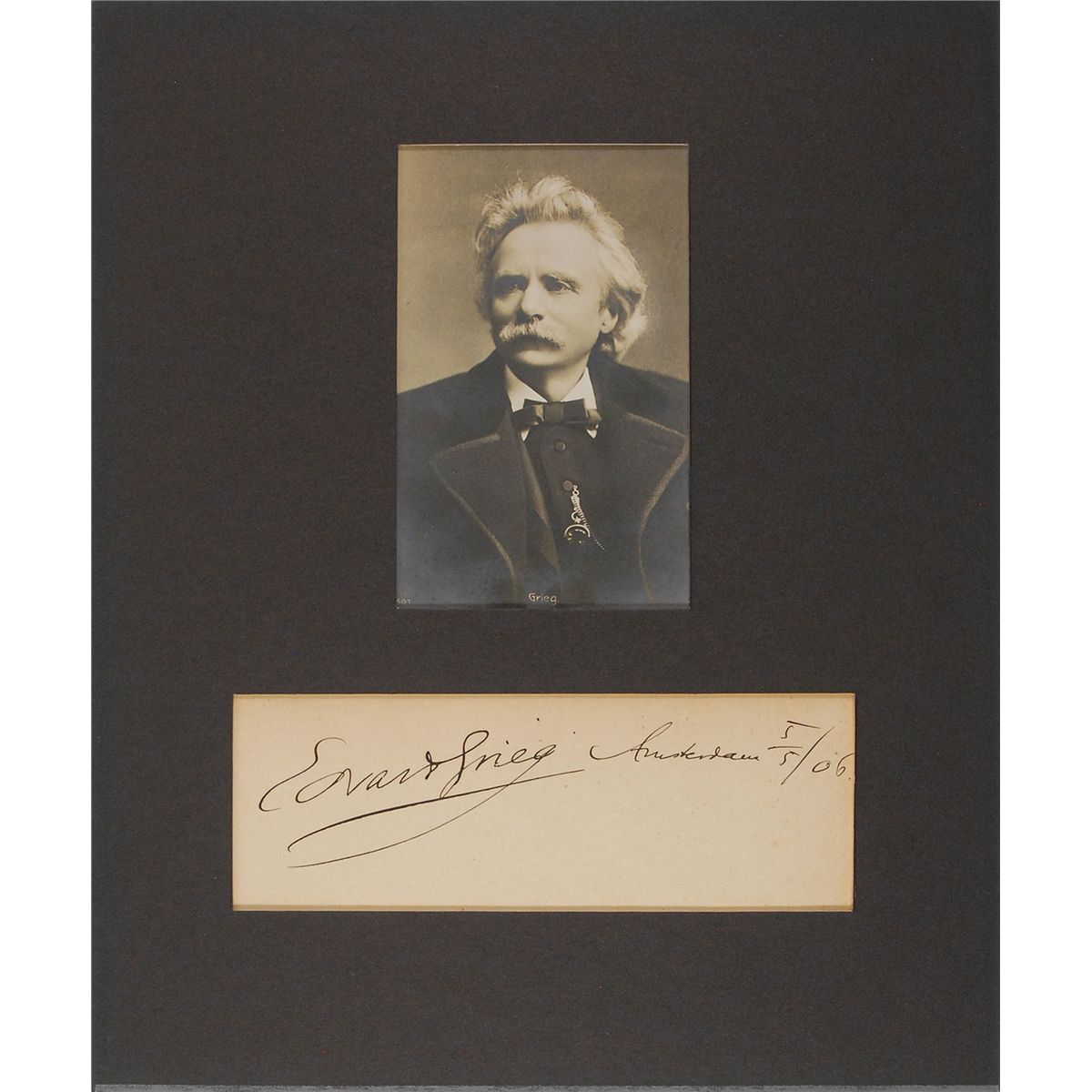 Ink signature, “Edvard Grieg, Amsterdam 5/5/06,” on an off-white album page. Matted with a portrait of Grieg to an overall size of 9.75 x 11.75. In fine condition, with a mild shade of uniform toning.