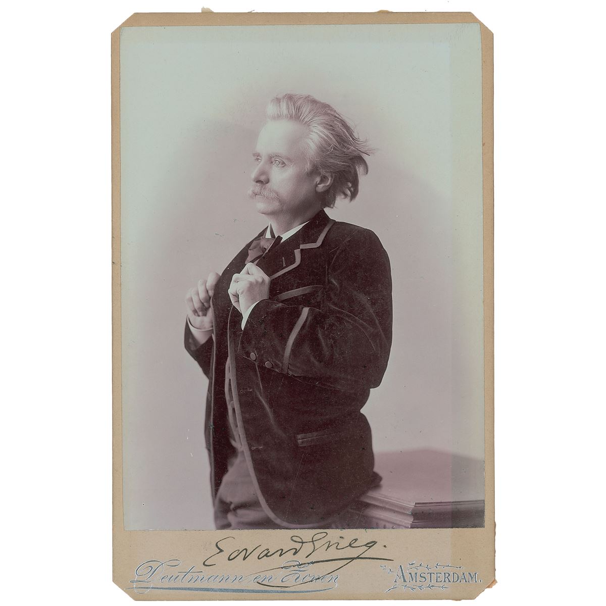 Important Norwegian composer and pianist (1843–1907) whose works, often with a strong nationalistic flavor, include such repertory staples as the incidential music to Peer Gynt and the Holberg suite. Crystal-clear 4.25 x 6.5 cabinet photo of Grieg in a three-quarter-length pose with his hands holding his lapels, beautifully signed on the mount in black ink. Published by Deutmann en Zonen of Amsterdam. Toning to borders, clipped corners, and mounting remnants to reverse, otherwise fine condition.