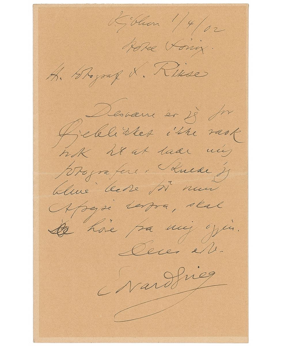 Important Norwegian composer and pianist (1843–1907) whose works, often with a strong nationalistic flavor, include such repertory staples as the incidental music to Peer Gynt and the Holberg suite. ALS in Norwegian, one page, 4.5 x 7, April 1, 1902. Untranslated letter to the photographer Fred Riise, informing him that he is not feeling well and that he would contact him before he leaves if he is doing better. In fine condition, with a uniform block of toning from previous display, and a diagonal crease.