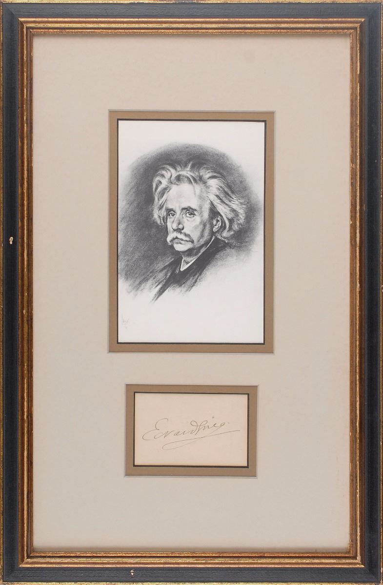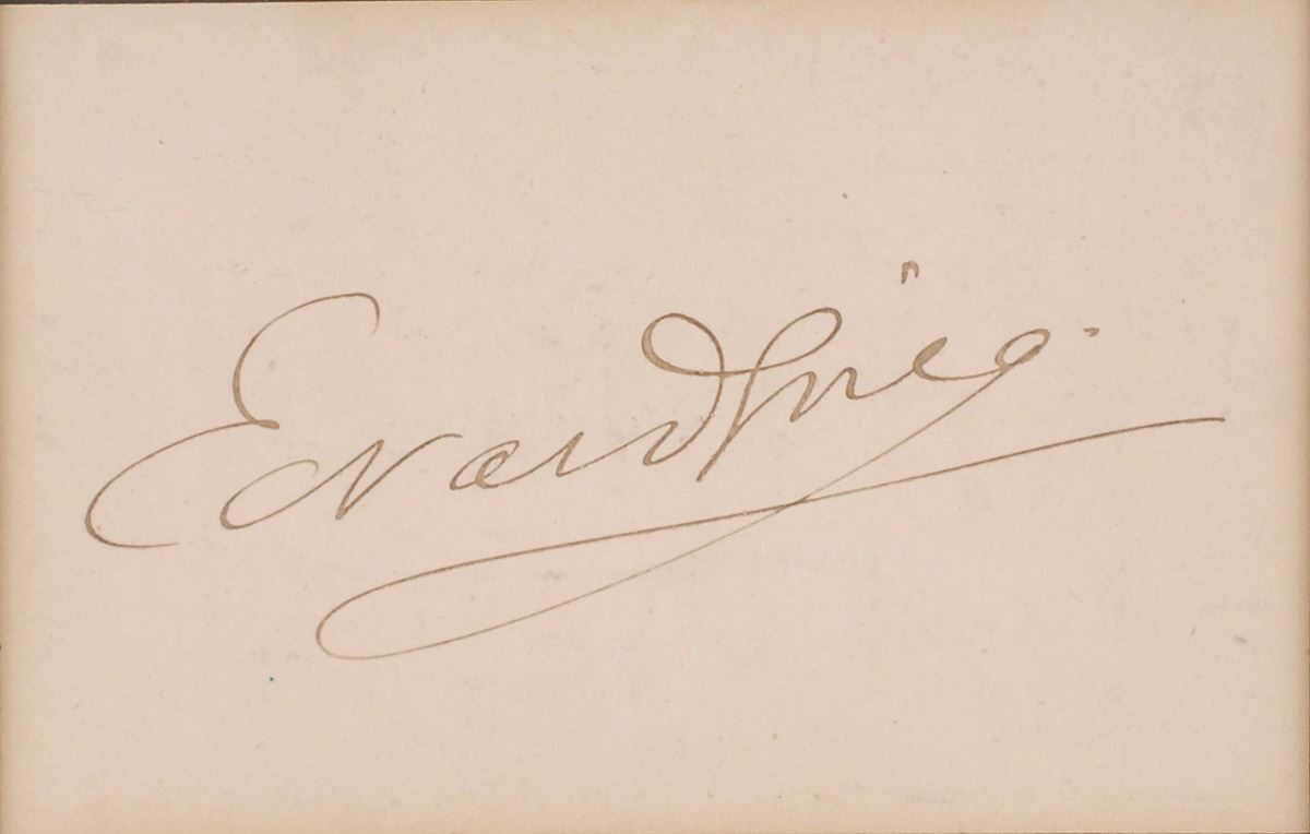 Ink signature, “Edvard Grieg,” on an off-white 3.5 x 2 card. Double-matted and framed with a portrait of the composer to an overall size of 11.5 x 17.5. In fine condition.