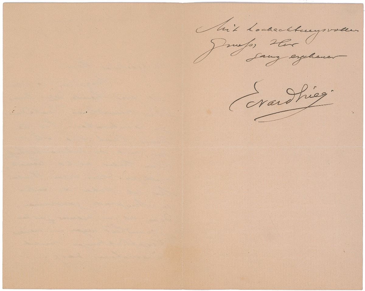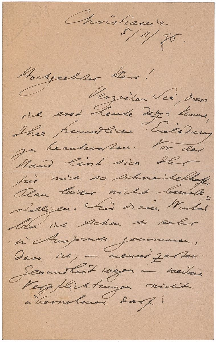 ALS in German, two pages on two adjoining sheets, 4.5 x 7, November 5, 1896. Untranslated letter to a friend declining an invitation due to a tight schedule and poor health. In fine condition, with erased pencil notations.