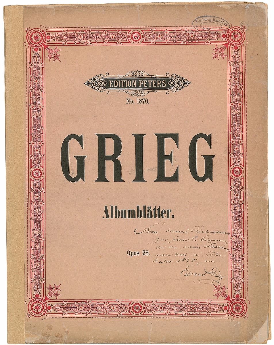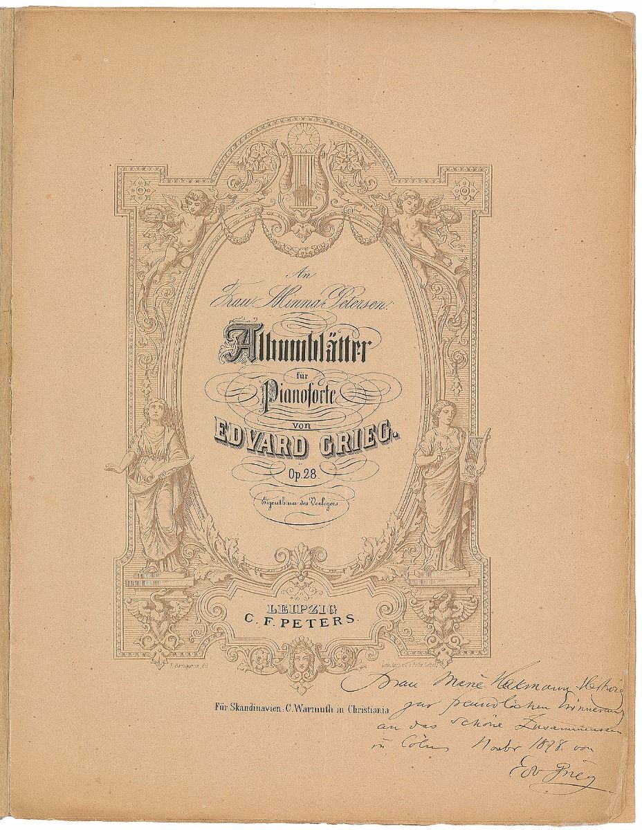 Twice-signed sheet music booklet for ‘Albumblatter fur Pianoforte, Op. 28,’ published in Leipzig by C. F. Peters, fifteen pages, 9.5 x 12.25, signed and inscribed on the front cover in German (translated), “To Frau Marie Heckmann-Hertwig in friendly remembrance of our happy time together in Cologne, November 1878, from Edvard Grieg.” Also signed and inscribed on the title page in the same manner. In very good to fine condition, with tape reinforcement to edges and hinge. Marie Heckmann was the wife of violinist Robert Heckmann, who gave the first performance of Grieg’s Op. 27 in Cologne on October 29, 1878.