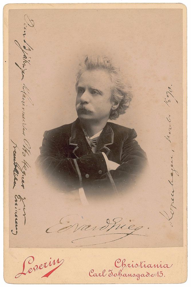 Rare 4.25 x 6.5 cabinet portrait of Grieg in a handsome half-length pose with folded arms, signed in fountain pen, "Edvard Grieg, Kopenhagen, Novbre 1890," who has added an inscription along the left side to Swiss pianist Otto Hegner. Published by Leverin, Christiania. In fine condition, with faint spotting to image.