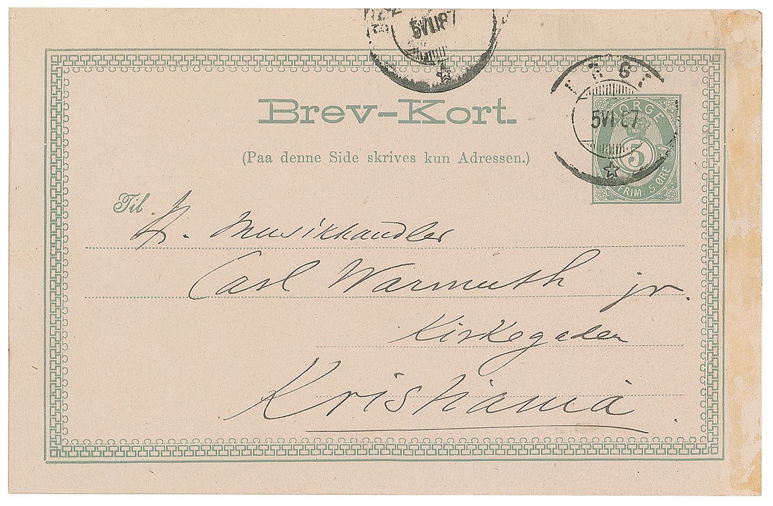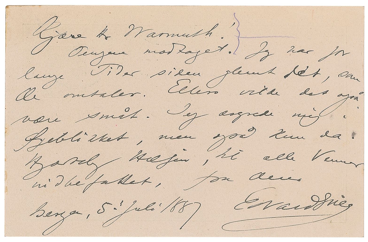 Untranslated ALS in Norwegian, one page on a 5.5 x 3.5 postcard, July 5, 1887. Grieg writes from Bergen to music publisher Carl Warmuth, Jr. In fine to very fine condition, with trivial adhesive residue along the right margin of the address side.