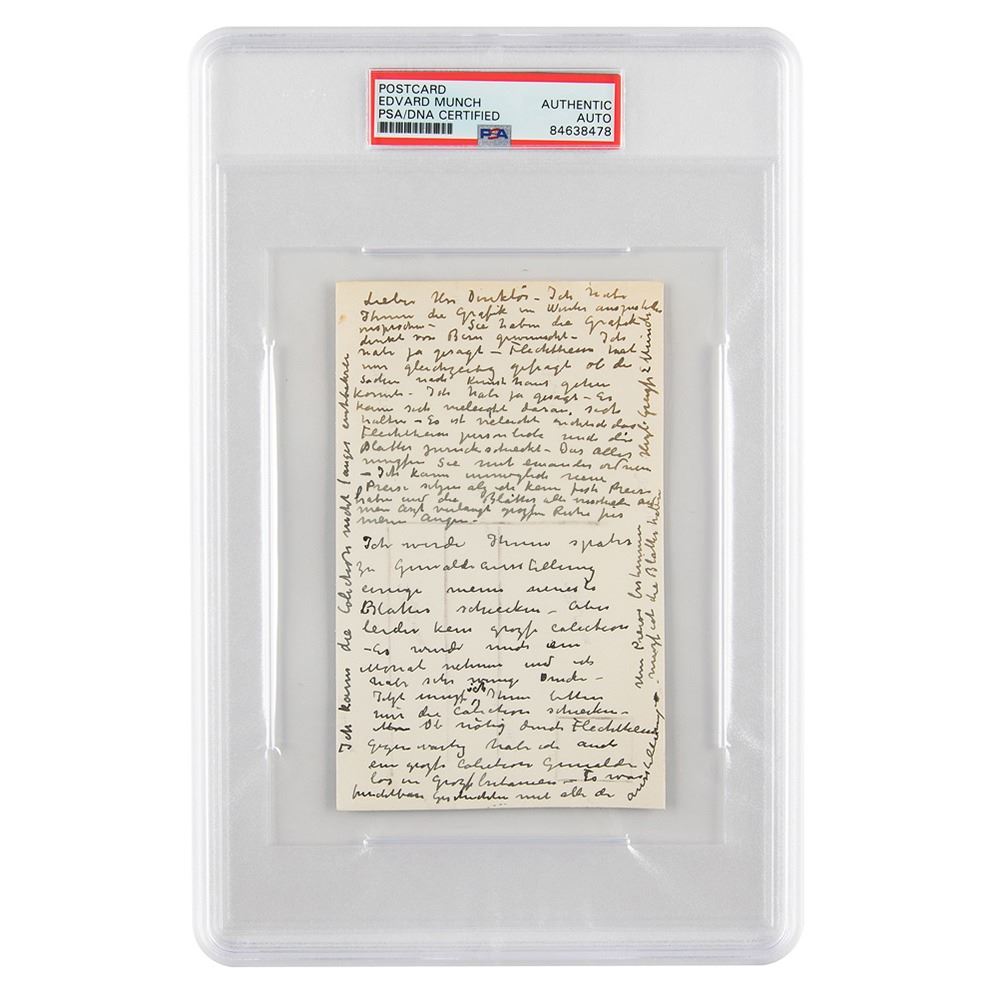 ALS in German, signed “E. Munch,†one page on a 5.75 x 3.5 postcard depicting Munch at an easel surrounded by his works, no date. Letter to the director of the Kunsthaus Zurich, Wilhelm Wartmann, whose portrait Munch painted in 1923. In part (roughly translated): "I have promised you the artwork in…You have requested the graphic…from Bern. I said yes—Flechtheim asked at the same time if he could give things to Kunsthaus. I said yes. He can very much hold on to it. It is perhaps right the Flechtheim personally me the plates sent back. You have to arrange all these things together. I can not possibly set new prices as I can have fixed prices…I will send you some of my latest sheets later on to the exhibition of paintings. But unfortunately no great collection. It would take me to morals and I have very little pressure. Now I have to ask you to send me the collection. If necessary by Flechtheim presently I have also a great collection painting loose in the UK. So what a terrible story with all the exhibitions. To get prices I must have the sheets…I can not miss the collection for a long time." In fine condition. Alfred Flechtheim was a German art dealer and collector. Encapsulated in a PSA/DNA authentication holder.