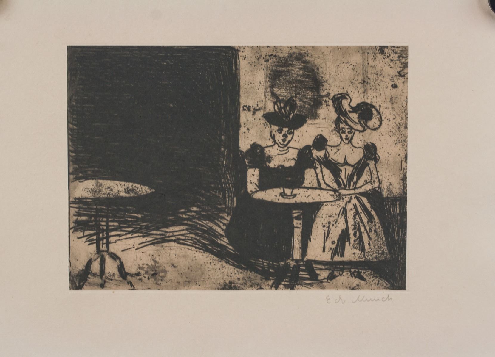 Lithograph on paper. Featuring a portrait scene within cafe. Signed Ed Munch in pencil on the lower right corner. Attributed to Edvard Munch (1863-1944, Norwegian). 21 x 29 cm (8.3 x 11.4 inches). PROVENANCE: This lot carries limited provenance from a Private British collection
