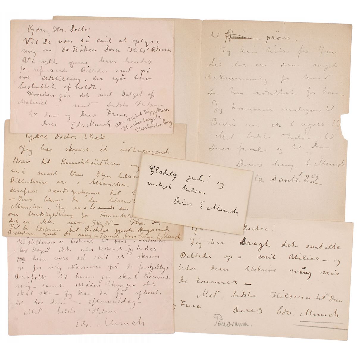 Collection of five ALSs in Danish, each signed “E. Munch” or “Edv. Munch,” totaling six pages, no dates but four postmarked 1893; and a bold ink signature and inscription on an off-white card. All are to the German critic, writer, and collector Julius Elias. Most content discusses arrangements for the 1893 Berlin exhibition at which The Scream was first exhibited, including: a remark that he has “brought the said picture up to my studio”; a request for the address of Dora Hitz as he would like to include her two rejected paintings in their exhibition; a statement that the exhibition has been fixed for December, although the day is not yet certain; a request for the names of journalists whom he might contact in connection with the exhibition; an inquiry concerning portfolios of lithographs and woodcuts he would like to find buyers for; a mention of the poet Jonas Lie; and Christmas greetings. In overall very good to fine condition, with some toning and soiling to edges, and a bit of paper loss to the edge of one letter affecting one word. Munch first achieved notoriety in Berlin in 1892, when a solo exhibition of his works at the conservative Berlin Artists Association was shut down after a week due to public outrage. Painted in 1893, The Scream was first exhibited as part of the six-painting series titled The Frieze of Life, which Munch continued to work on over the course of the decade. Featuring multiple letters focused on the exhibition that revealed Munch’s incredibly famous work to the world, this is an absolutely exceptional collection.