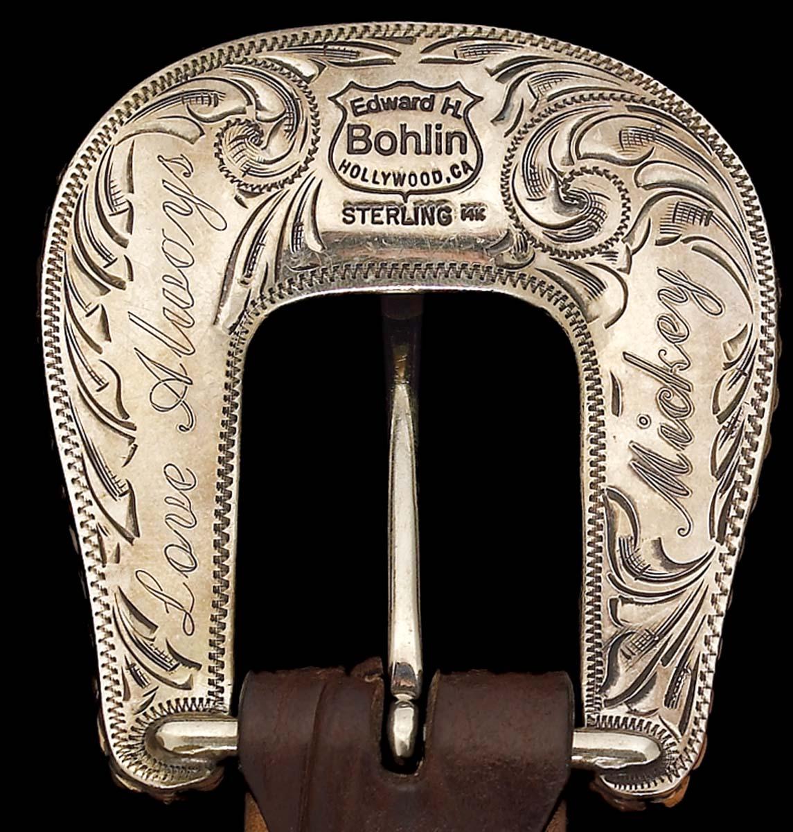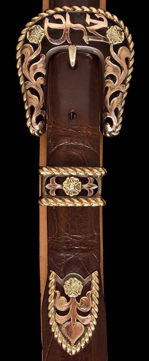 Rose and yellow 14K gold, 1-inch, 3-piece filigreed sterling buckle set with gold rope edge. On 31 brown alligator belt, initials engraved and inscribed on backside of buckle