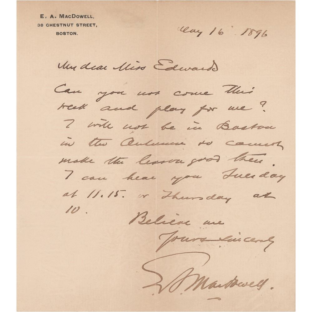 ALS signed “E. A. MacDowell,” one page, 5.5 x 6, personal letterhead, May 16, 1896. Letter to "Miss Edwards," in full: "Can you not come this week and play for me? I will not be in Boston in the Autumn so cannot make the lesson good then. I can hear you Tuesday at 11.15, or Thursday at 10." In fine condition, with light show-through at the top from old adhesive residue on the back.