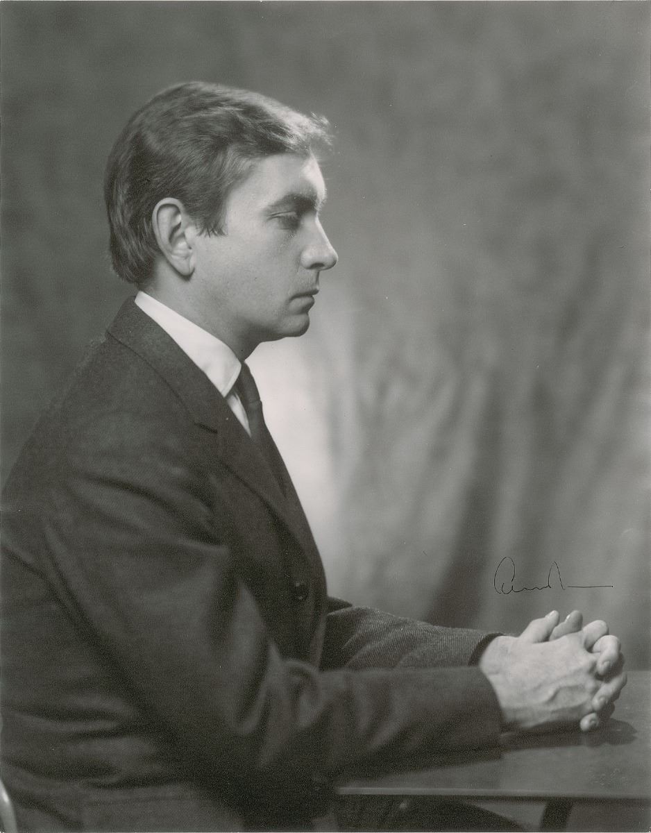Oversized matte-finish 11 x 14 photo of Albee in profile, signed in black ballpoint. Blindstamped in the lower right corner by Pach Bros. In fine condition, with light rippling along the edges.