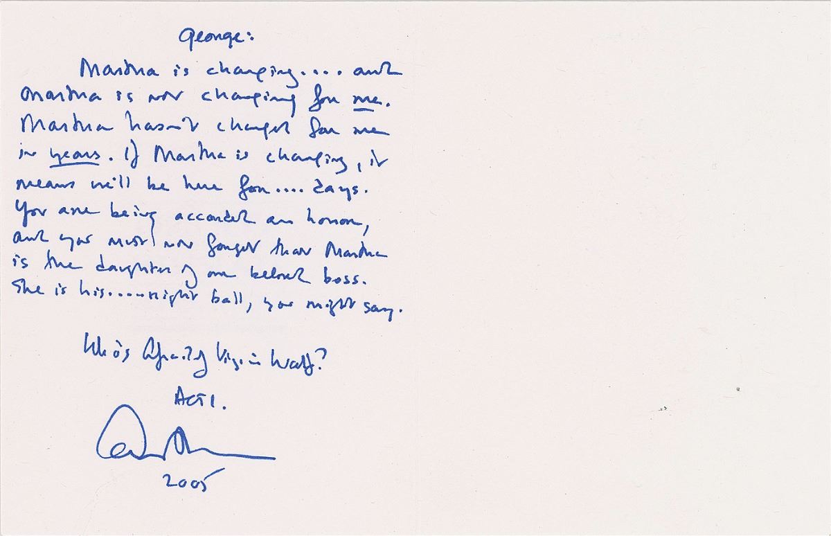 AQS penned inside a 4.25 x 5.5 card from Young Harris College, titled and signed at the bottom, "Who's Afraid of Virginia Woolf? Act I. Edward Albee, 2005." In full: "George: Martha is changing…and Martha is not changing for me. Martha hasn't changed for me in years. If Martha is changing, it means we're going to be here for…days. You're being accorded an honor, and you must not forget that Martha is the daughter of our beloved boss. She is his…right ball, you might say." In fine condition.