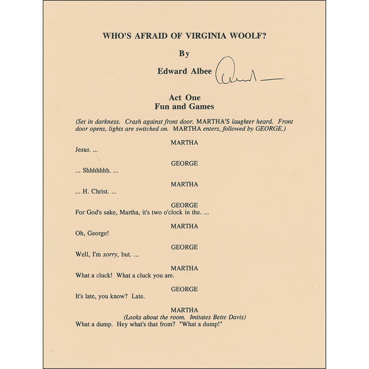 Souvenir typescript, one page, 8.5 x 11, from Act One of ‘Who’s Afraid of Virginia Woolf,’ signed at the top in black ink. In very fine condition.