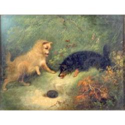 Edward Armfield (19th C.) oil on canvas, Terriers rabbiting, 12 x 16 ins....